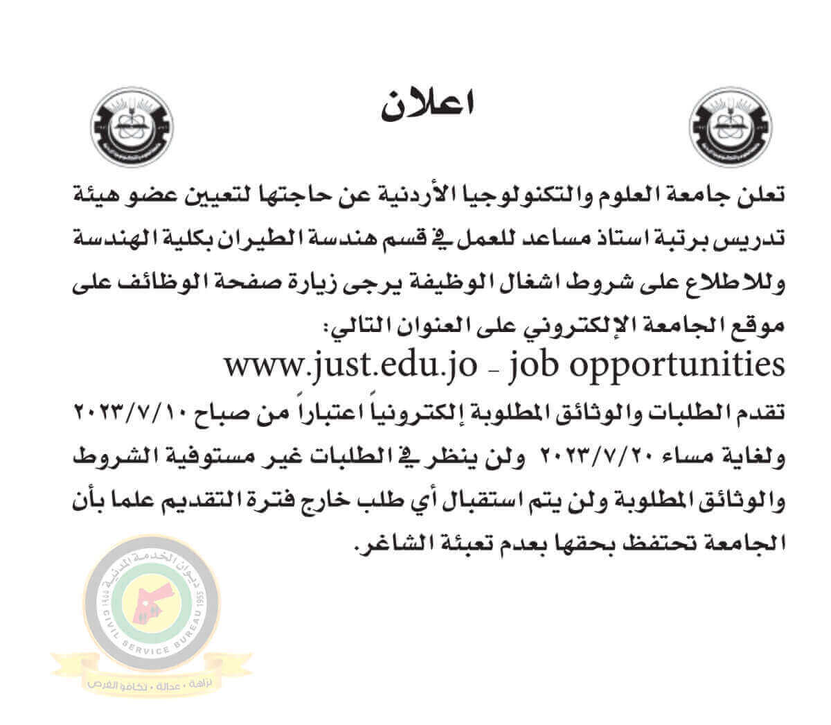 اعلان تعيين اعضاء هيئة تدريسية صادرعن جامعة العلوم والتكنولوجيا الأردنية - كلية الهندسة
