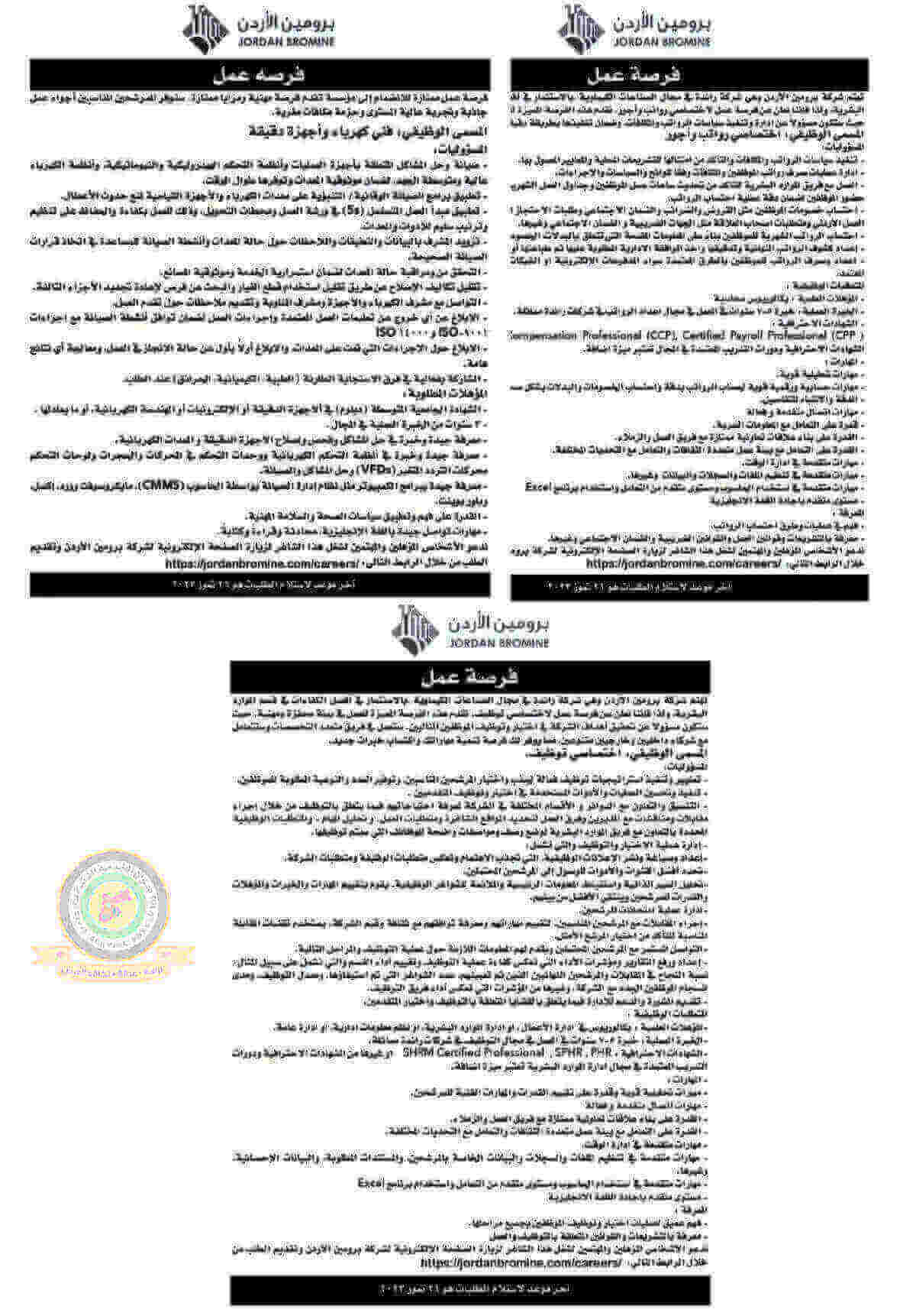 اعلان وظائف شاغرة صادرعن شركة برومين الأردن
