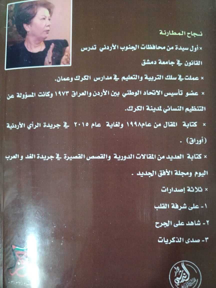 22 الاعلامي- أصدرت الكاتبة نجاح المطارنة ثلاثة إصدارات في المقالة عصارة تاريخ من العلم والعمل الجاد تحت عناوين كبيرة تناولت بها فترة زمنية مهمة في التاريخ الأردني والعربي حيث كتبت في كتابها شاهد على الجرح مجموعة مقالات سياسية تؤرشف للعديد من الأحداث المحلية والفلسطينية والعربية بعين النشمية الأردنية المثقفة والمتابعة للأحداث التي لم تكن بعيدة عن ما يدور حولنا كأمة من أحداث تترجمها على أرض الواقع تحاور ذاتها الوطنية والقومية والإسلامية لتصل مع القارئ الى إسلوب مقنع ومنطقي في تناول الموضوع كتاريخ ورؤية وواقع وما حتحول عليه الأمور فكانت متابعة للأحداث من حيث الأسباب والنتائج وما ذهبت عليه الإنقسامات العربية والمؤامرات على المنطقة وعلى عملية السلام فكانت كل الدول العربية حاضرة في مقالات المطارنة بين الرجاء والمأمول.