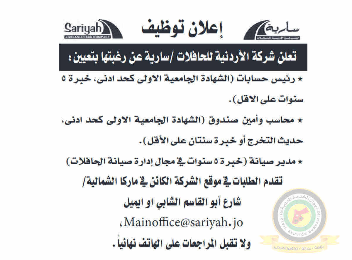 اعلان وظائف شاغرة صادرعن شركة الأردنية للحافلات
