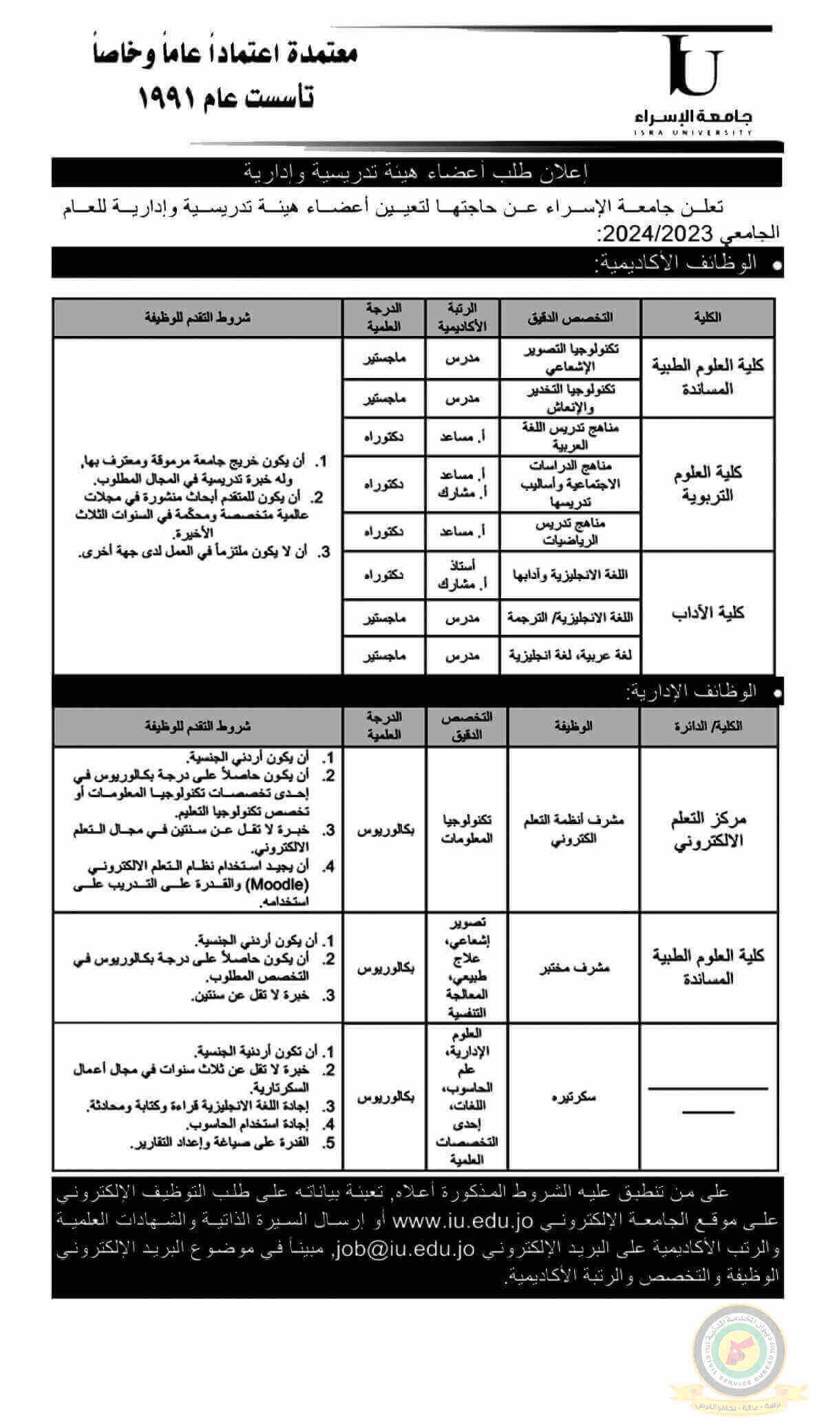 اعلان تعيين اعضاء هيئة تدريسية وادارية صادر عن جامعة الإسراء