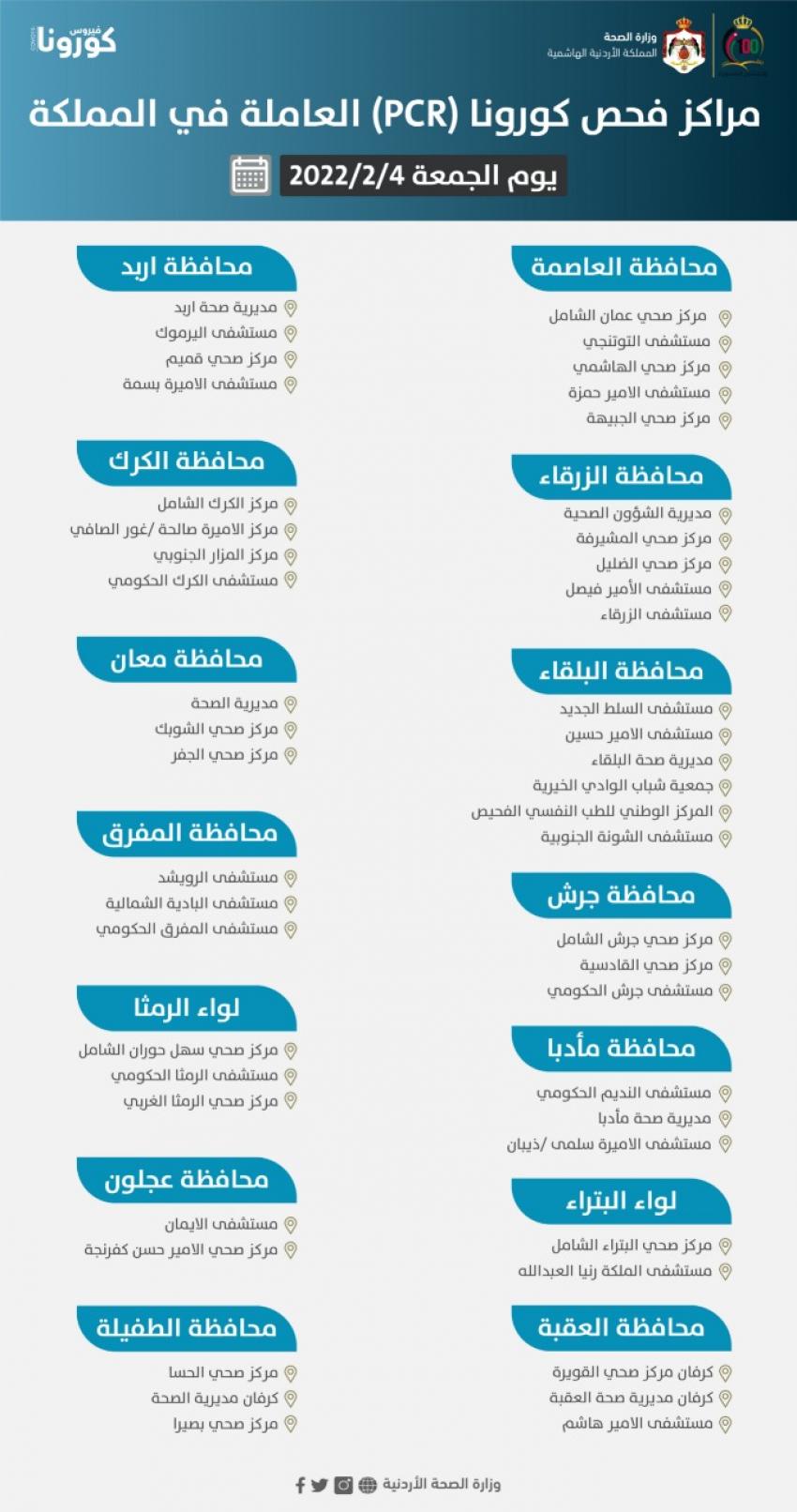 اعلنت وزارة الصحة قائمة اسماء مراكز فحص كورونا (PCR) العاملة يوم الجمعة 2022/2/4 في المملكة