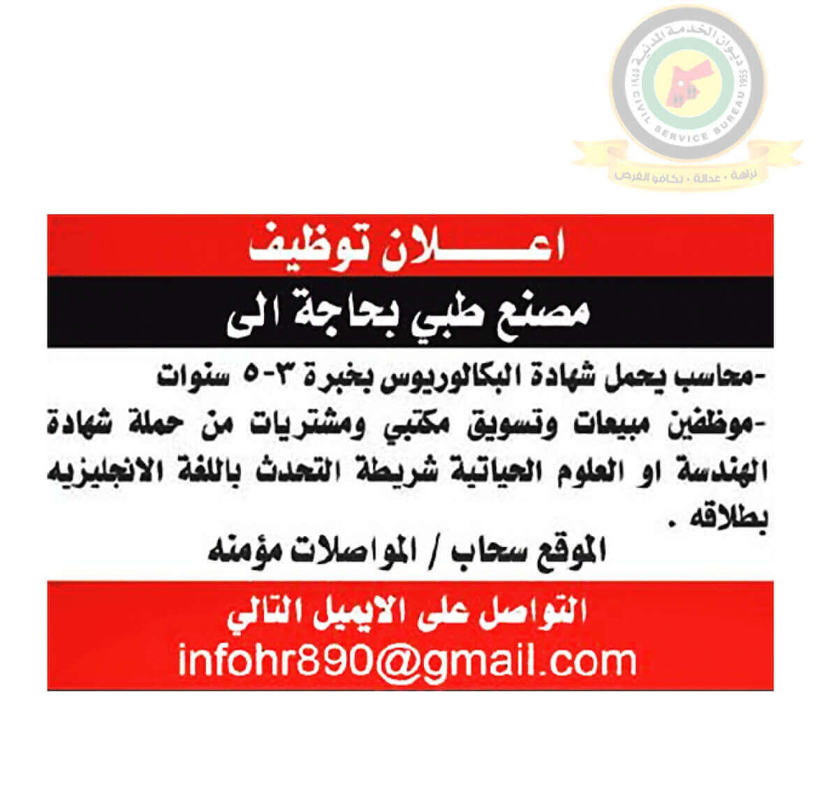 اعلان وظائف شاغرة محاسب صادرعن مصنع طبي