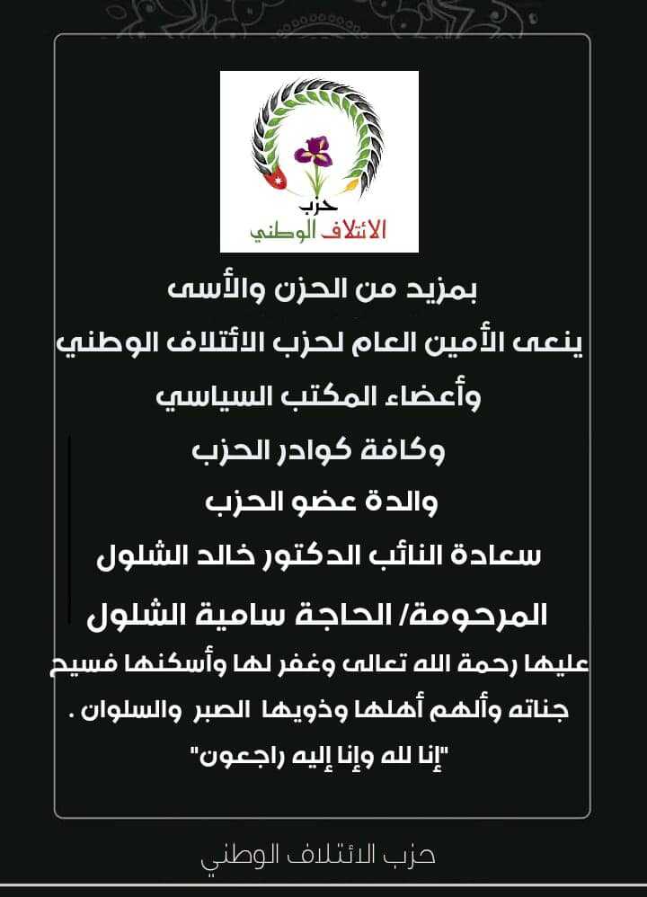 الأمين العام لحزب الائتلاف الوطني ينعى والدة النائب الدكتور خالد الشلول - عليها رحمة الله تعالى