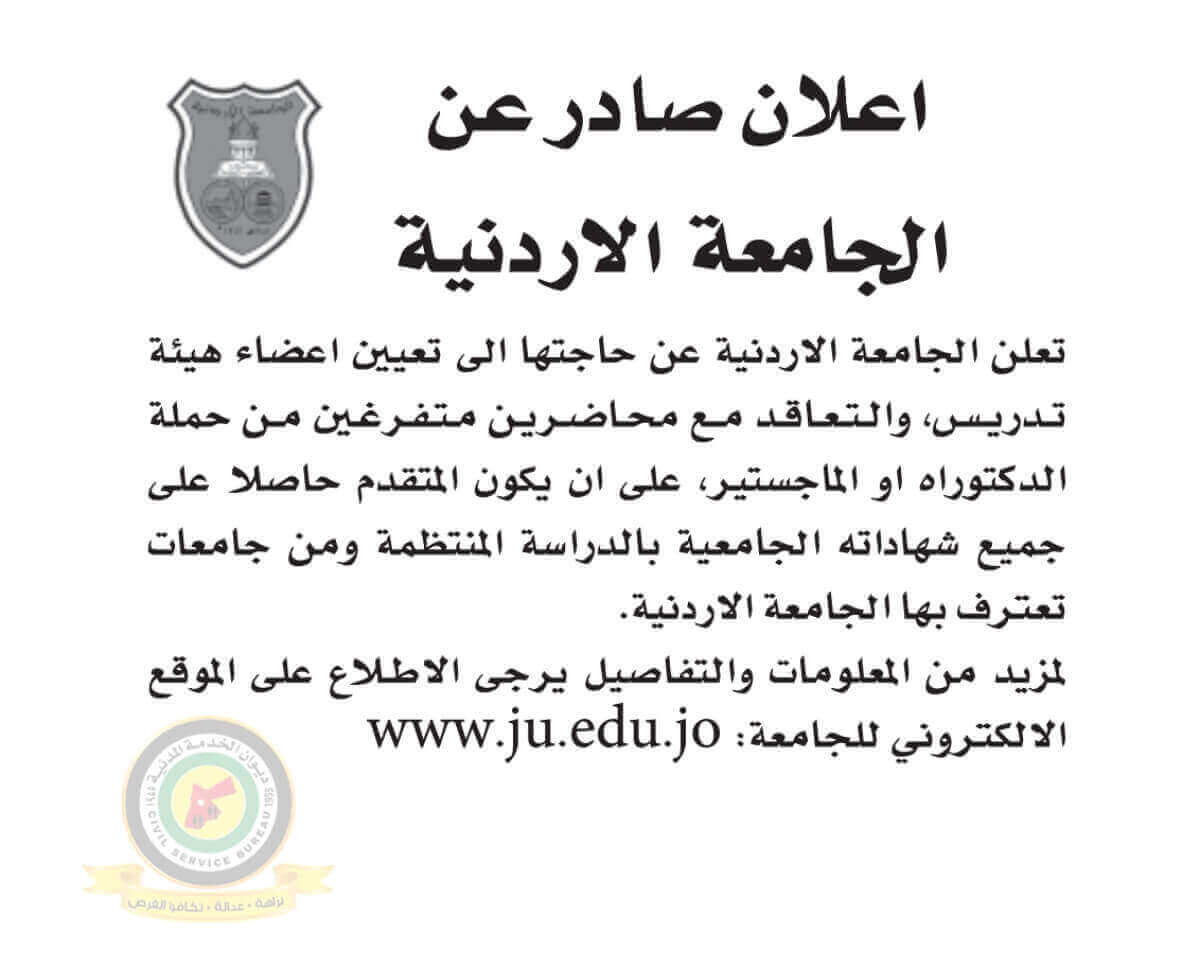 اعلان تعيين اعضاء هيئة تدريسية صادر عن الجامعة الأردنية