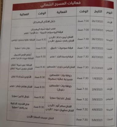 22 الاعلامي- فيما يلي جدول تفصيلي بفعاليات مهرجان جرش على مختلف المسارح والقاعات المخصصة للمهرجان، الذي انطلق رسميا يوم امس الاربعاء وينتهي رسميا يوم 5 أب (اغسطس) المقبل.