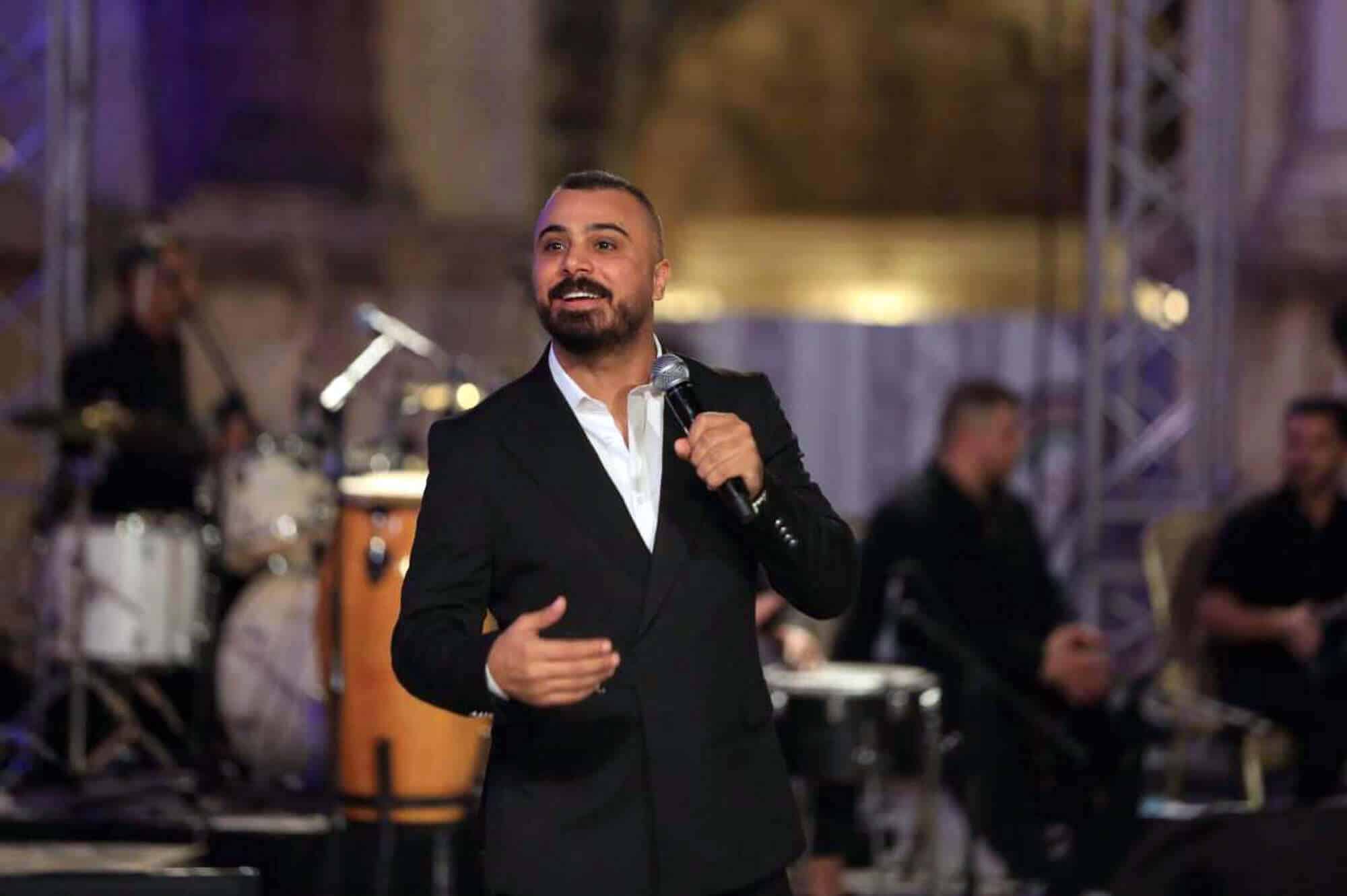 وعلى أنغام زفة "الحسين ورجوة"، التي قدمها بمناسبة زفاف سمو الأمير الحسين بن عبدالله الثاني، ولي العهد، بدأ علامة حفله مباركاً للشعب الأردني استمرار أفراحه، وقال للجمهور الحضور، أنه "يستمتع بالغناء في مهرجان جرش النابض بالفرح والسعادة".