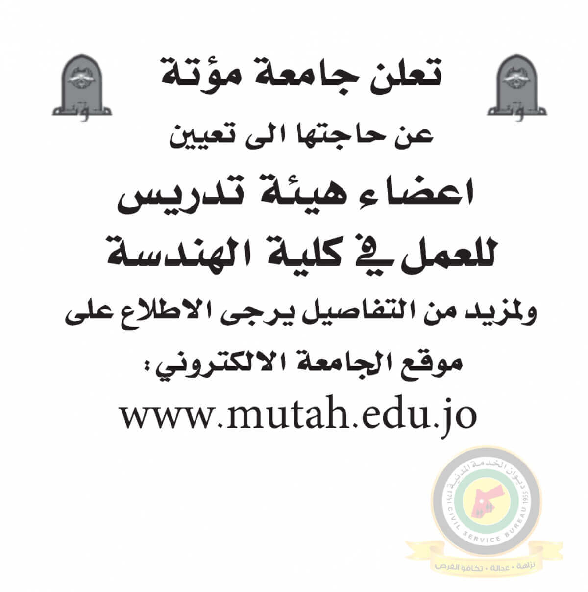 اعلان تعيين اعضاء هيئة تدريسية صادر عن جامعة مؤتة - كلية الهندسة