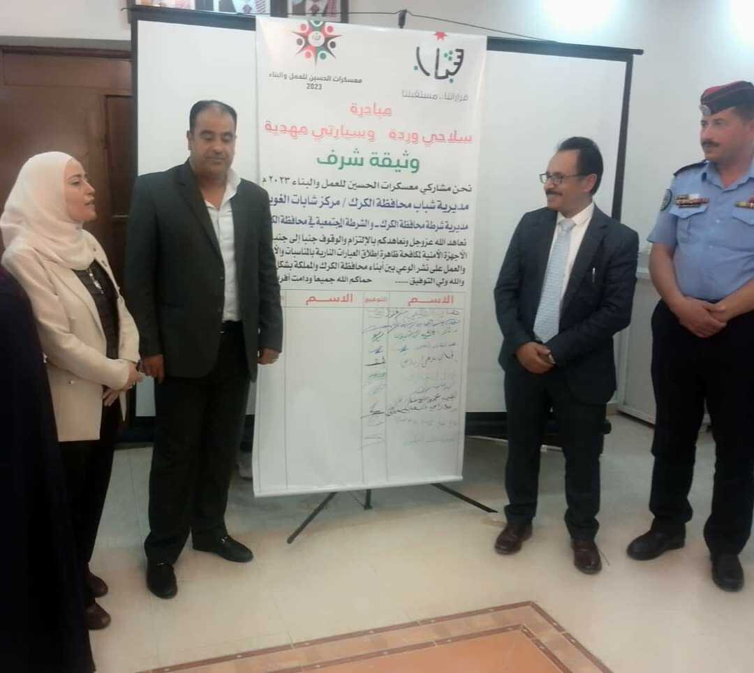 وفي نهاية المعسكر تم توقيع وثيقة شرف لوقف إطلاق العيارات النارية تحت مبادرة "سلاحي وردة …..وسيارتي مهديه" بالتعاون مع مديرية شرطة الكرك والشرطة المجتمعية.