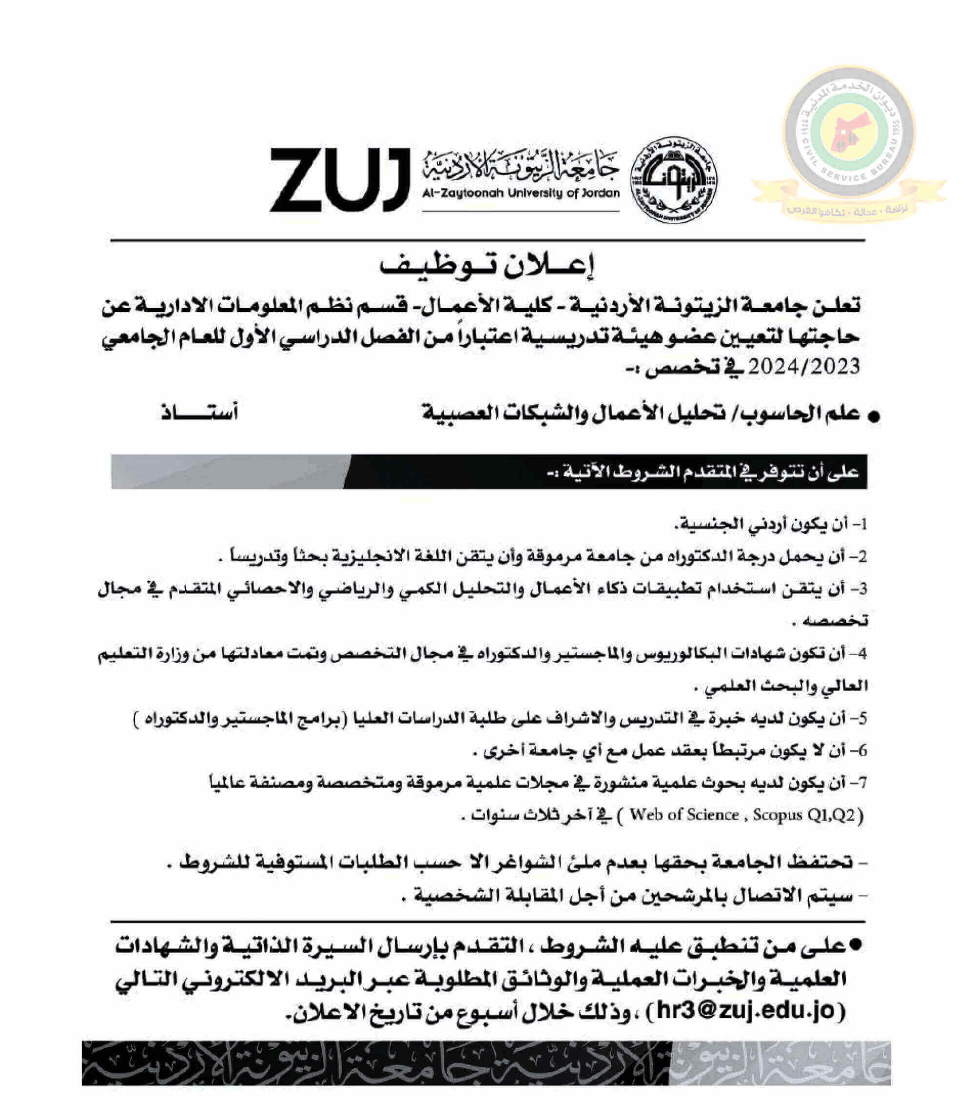 اعلان تعيين اعضاء هيئة تدريسية صادر عن جامعة الزيتونة الأردنية -كلية الأعمال -قسم نظم المعلومات الإدارية