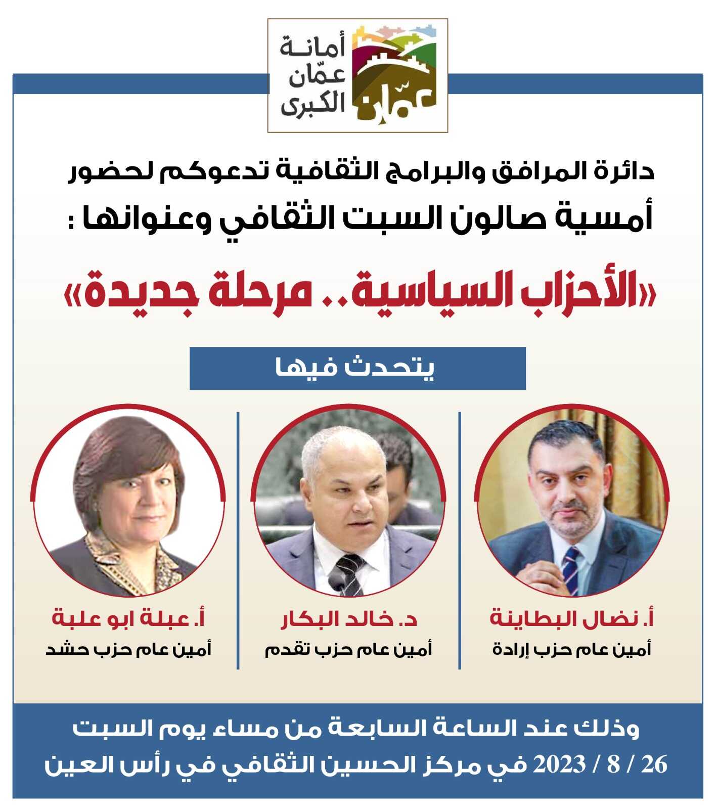 22 الاعلامي - عمان- يستضيف صالون السبت الثقافي لأمانة عمان الكبرى مساء بعد غد السبت أمسية حول "الأحزاب السياسية.. ومرحلة جديدة"، تقام في مركز الحسين الثقافي في رأس العين.