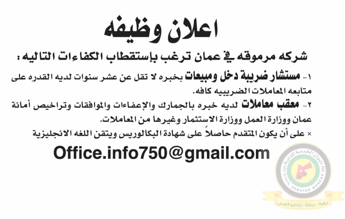 اعلان وظائف شاغرة صادرعن شركة مرموقة في عمان
