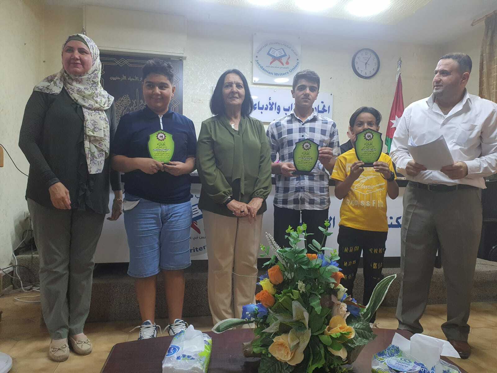 الثالث مكرر نجلاء خاطر وقامت راعية الحفل الأديبة سلامة عبد الحق والإعلامية رند غرايبة مديرة الإذاعة الأردنية ورئيس منتدى الجياد الأديب سامر المعاني ورئيس المبادرة الصحفي محمود الشبول بتوزيع الجوائز على الفائزين وتوزيع الشهادات على جميع الفتيان المشاركين بالمسابقة وتكريم لجان التحكيم وأعضاء المبادرة. وتم التقاط الصور الجماعية للحضور والمشاركين وسط فرحة أهالي المشاركين واستحسان الحضور .