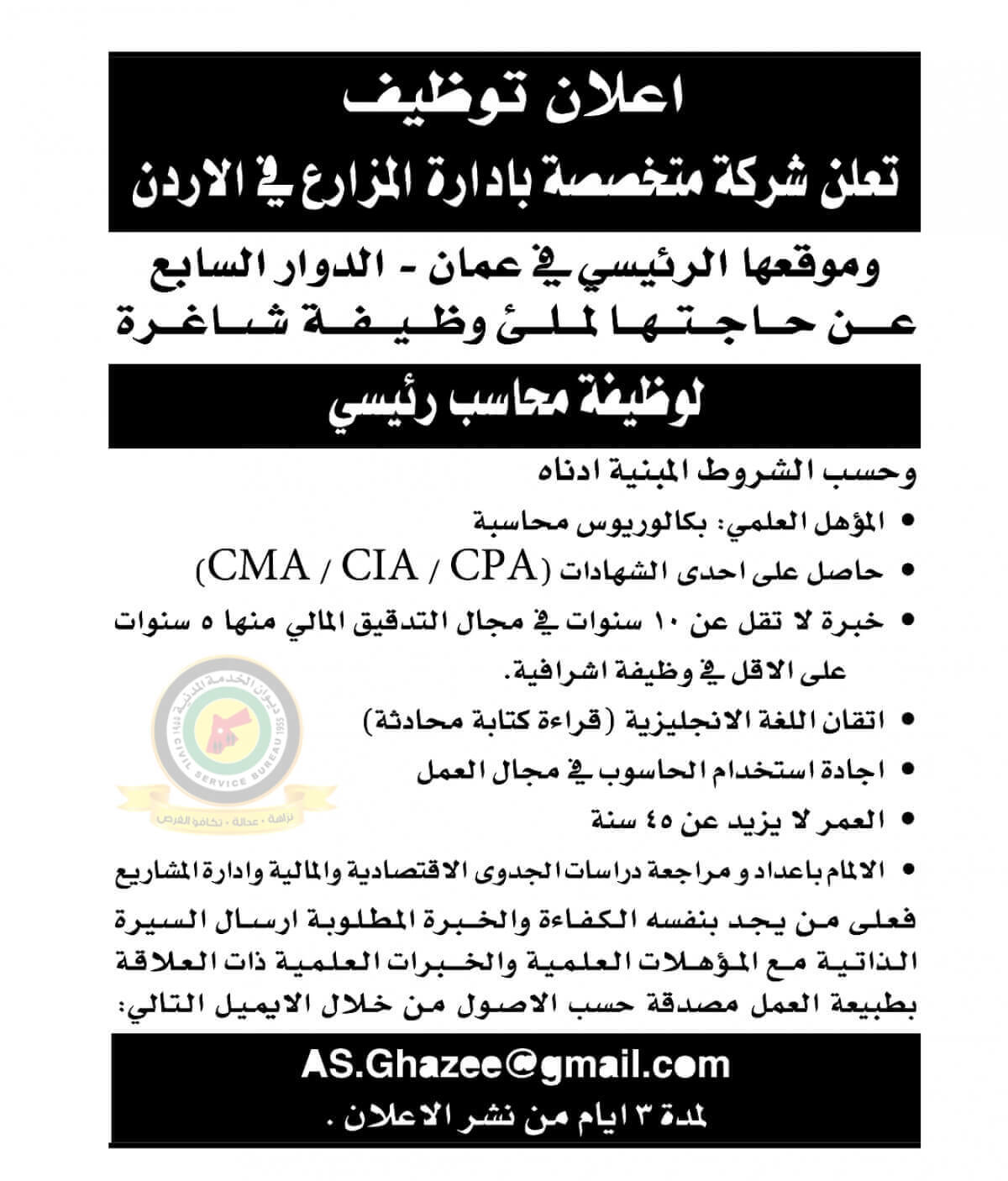 اعلان وظائف شاغرة محاسب رئيسي صادرعن شركة متخصصة بإدارة المزارع في الأردن
