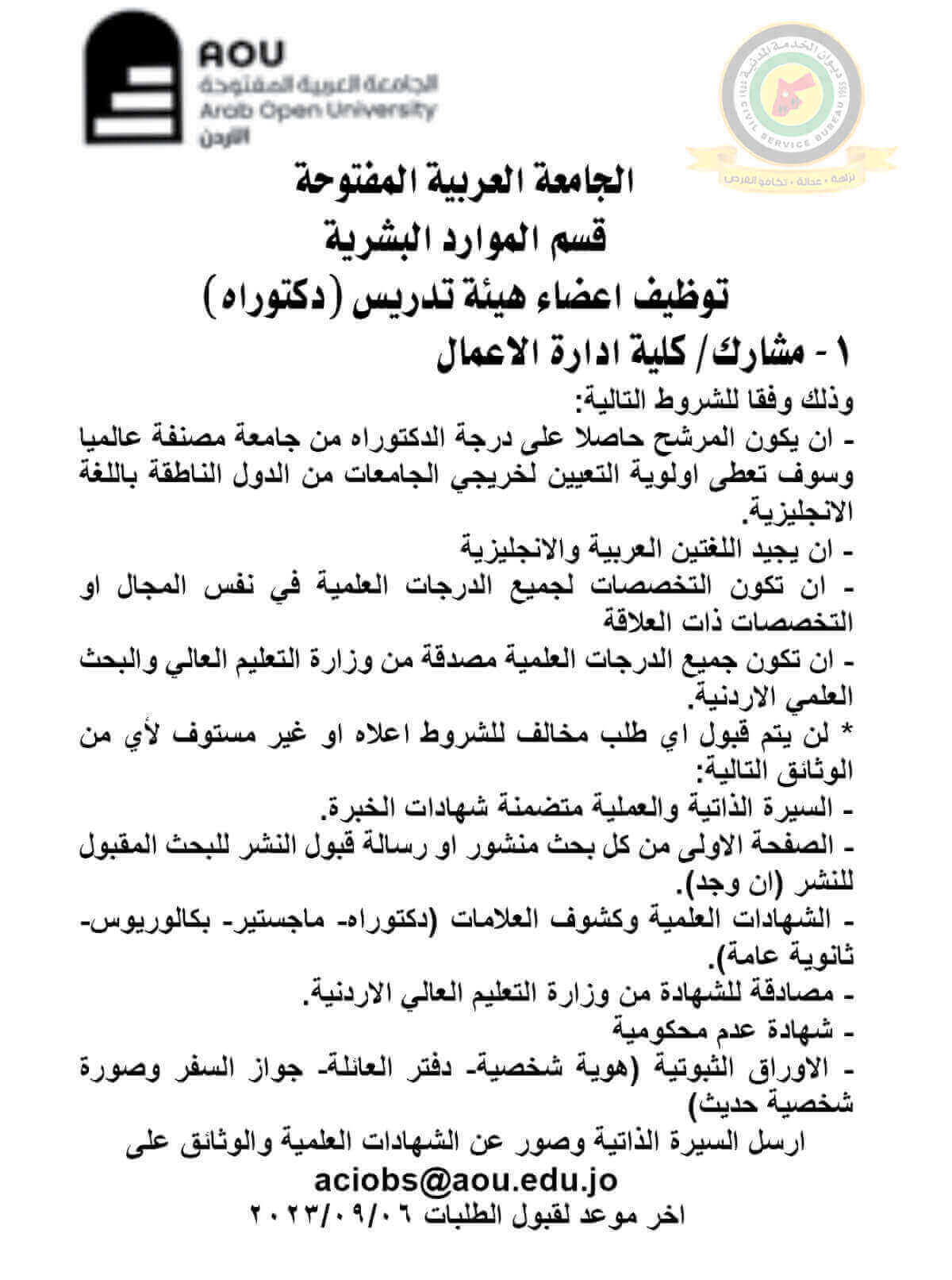 اعلان تعيين اعضاء هيئة تدريسية صادر عن الجامعة العربية المفتوحة