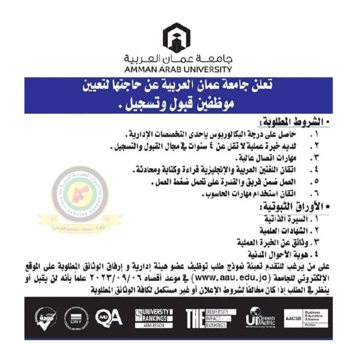 اعلان وظائف شاغرة موظفين قبول وتسجيل صادرعن جامعة عمان العربية