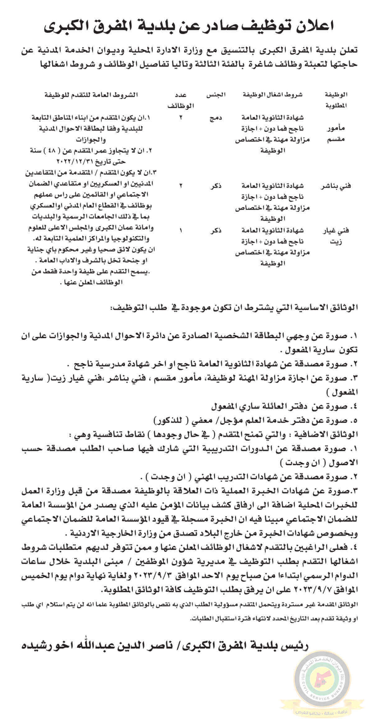 اعلان وظائف شاغرة بالفئة الثالثة صادرعن بلدية المفرق الكبرى