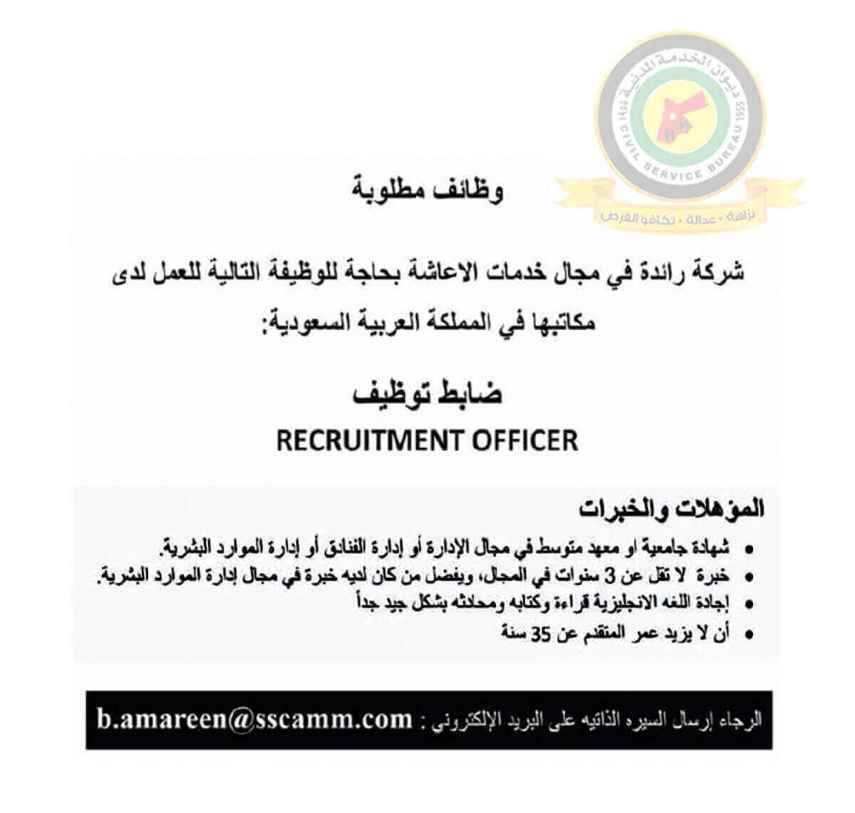 اعلان وظائف شاغرة ضابط توظيف صادرعن شركة رائدة في مجال خدمات الإعاشة في المملكة العربية السعودية