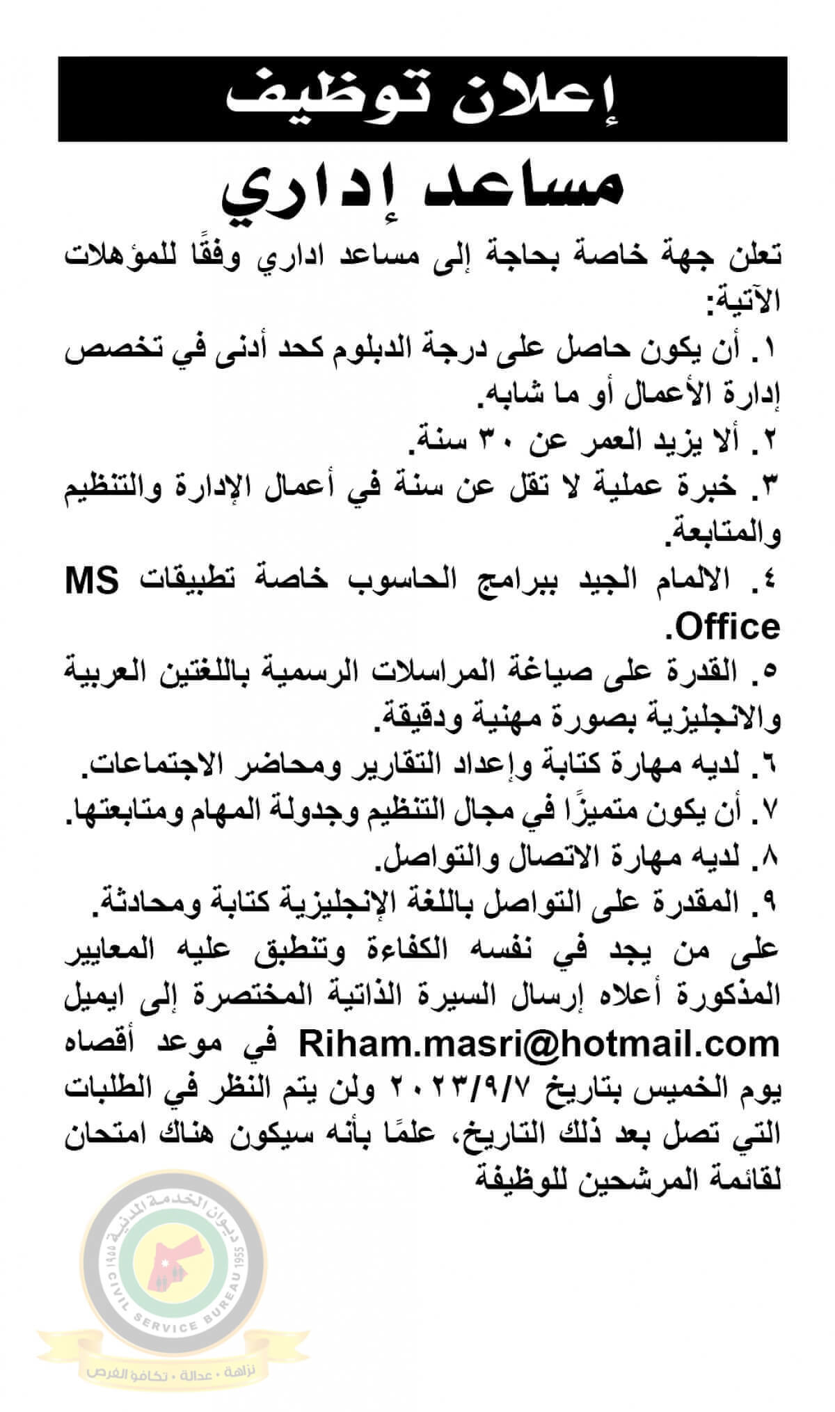 اعلان وظائف شاغرة مساعد اداري صادرعن جهة خاصة