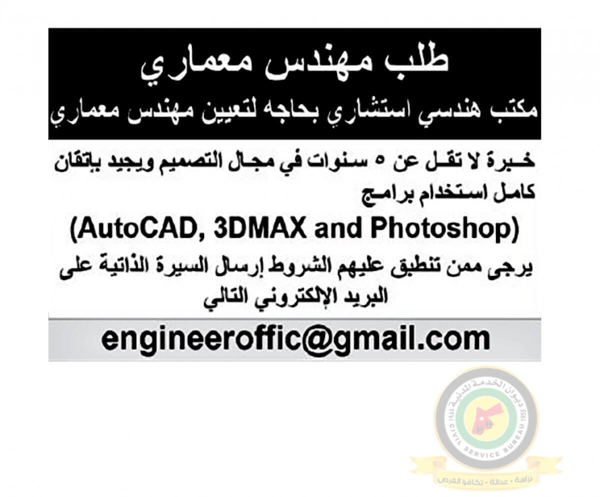 اعلان وظائف شاغرة مهندس معماري صادرعن مكتب هندسي استشاري
