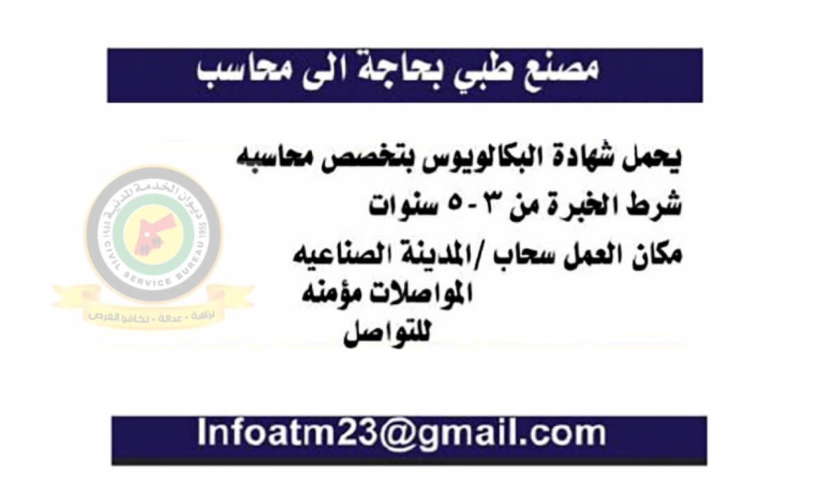 اعلان وظائف شاغرة محاسب صادرعن مصنع طبي