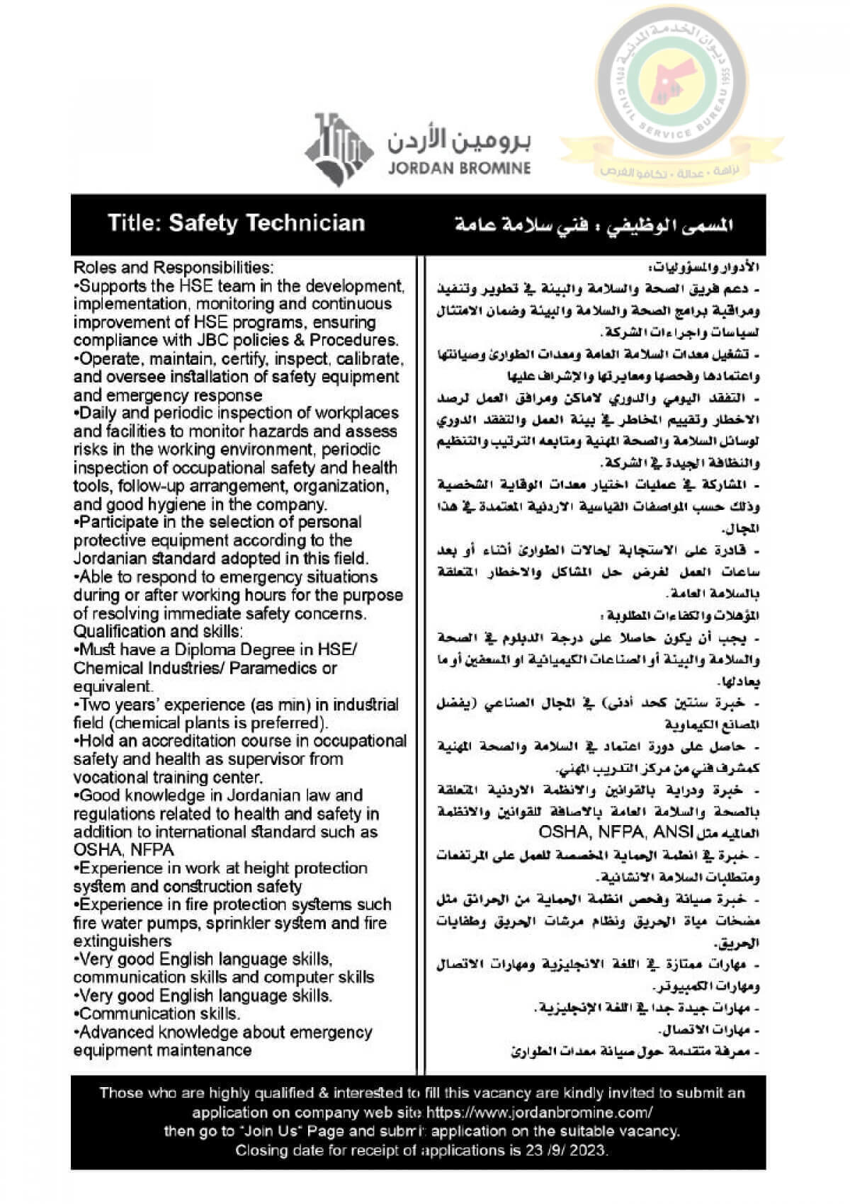 اعلان وظائف شاغرة فني سلامة عامة صادرعن شركة برومين الأردن