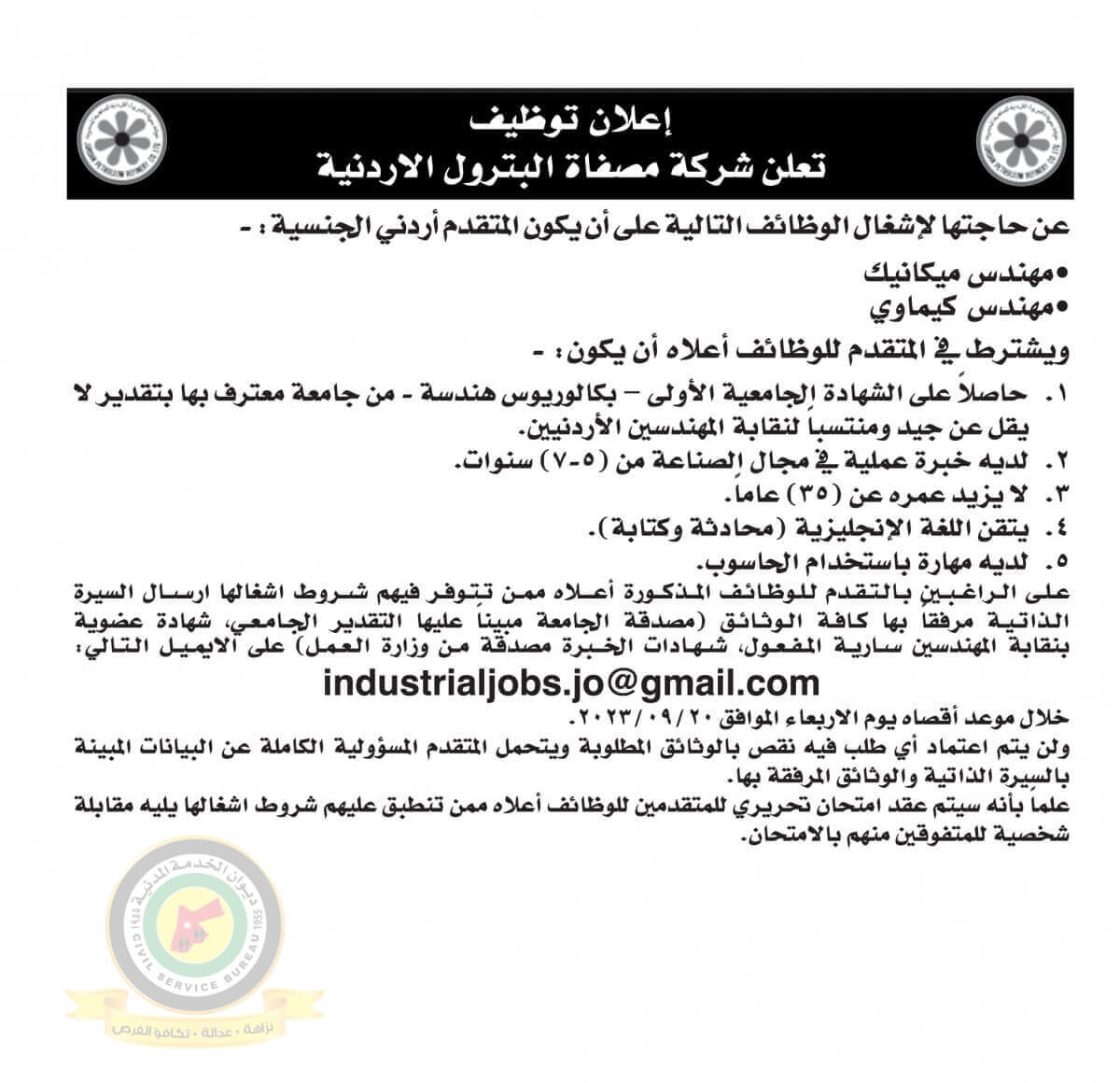 اعلان وظائف شاغرة صادرعن شركة مصفاة البترول الاردنية