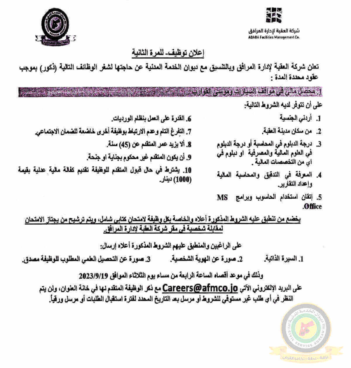 اعلان وظائف شاغرة بموجب عقود محددة المدة صادرعن شركة العقبة لإدارة المرافق