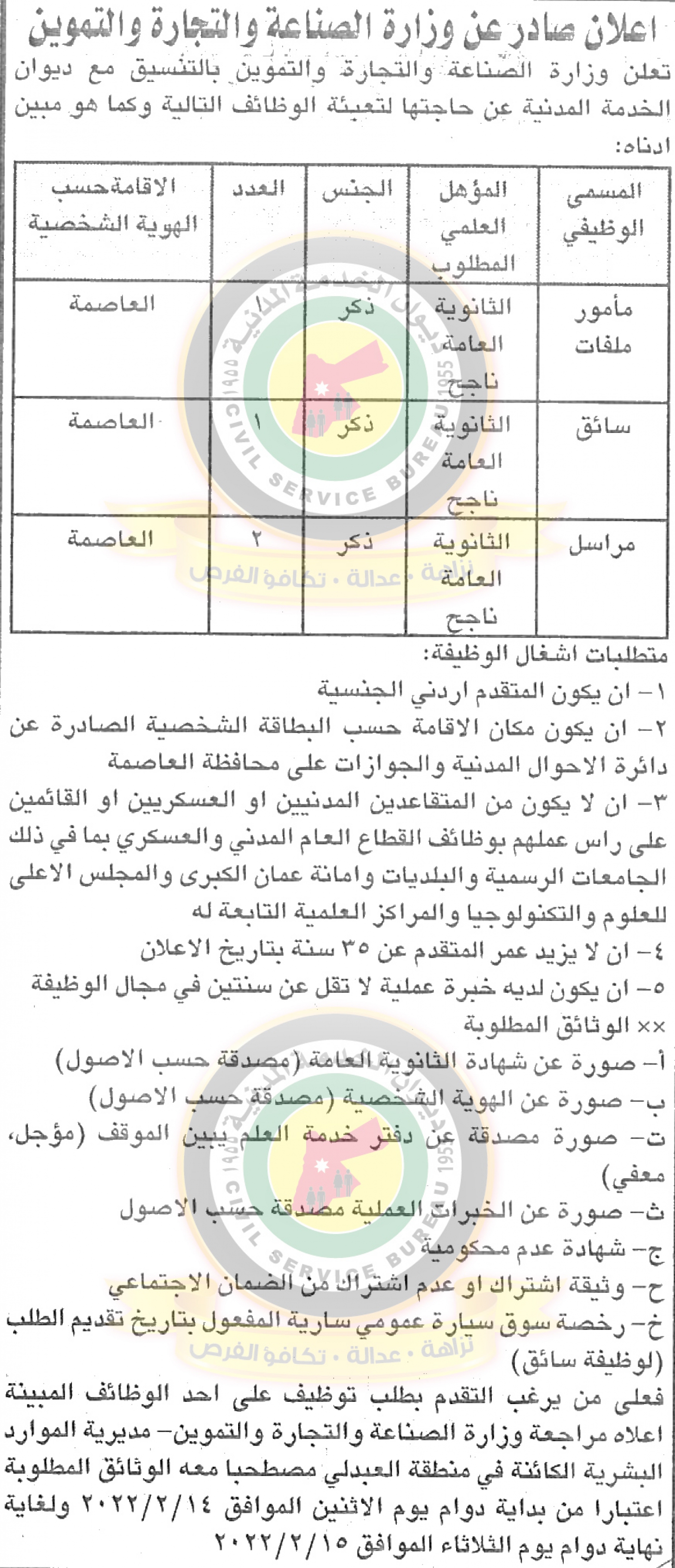 نُشر على موقع ديوان الخدمة المدنية اعلان صادر عن وزارة الصناعة والتجارة والتموين بالتنسيق مع ديوان الخدمة المدنية عن حاجتها لتعبئة الوظائف التالية كما هو مبين ادناه :