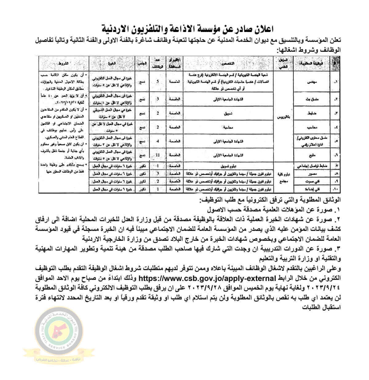 اعلان وظائف شاغرة بالفئة الأولى والثانية صادرعن مؤسسة الإذاعة والتلفزيون
