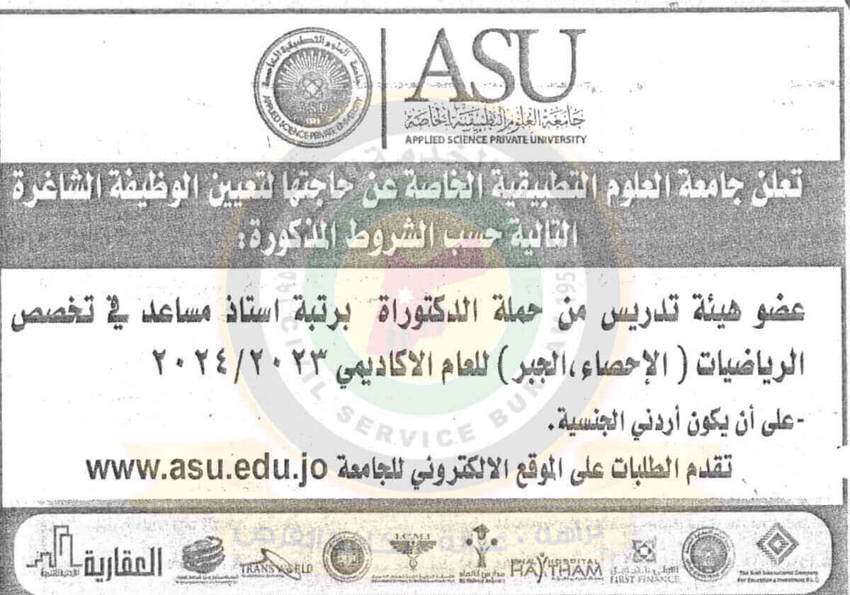 اعلان عن توفر وظيفة شاغرة عضو هيئة تدريس من حملة الدكتوراة برتبة أستاذ مساعد في تخصص الرياضيات والجبر صادر عن جامعة العلوم التطبيقية الخاصة