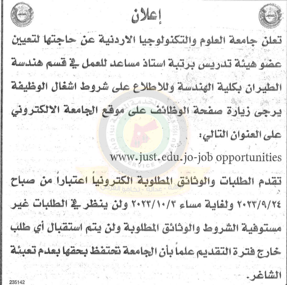 اعلان عن توفر وظيفة عضو هيئة تدريس صادر عن جامعة العلوم والتكنولوجيا الاردنية