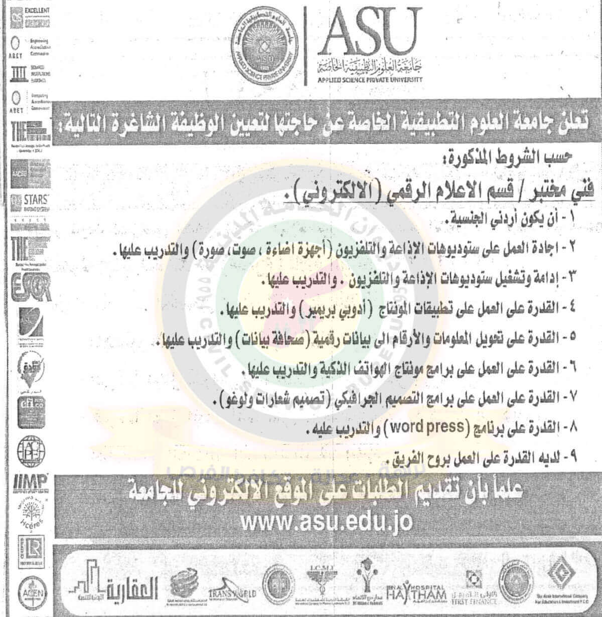 اعلان توفر وظيفة شاغرة فني مختبر (قسم الاعلام الرقمي) صادر عن جامعة العلوم التطبيقية الخاصة