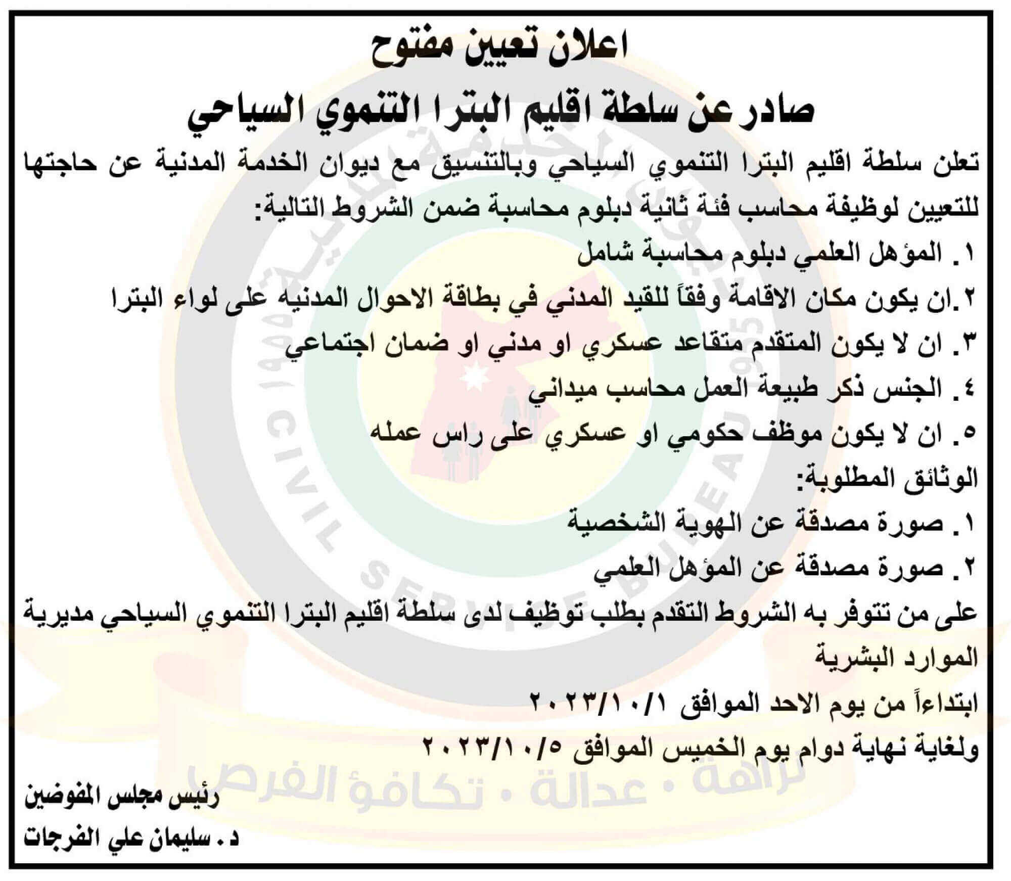 اعلان وظيفة شاغرة صادر عن سلطة اقليم البترا التنموي السياحي