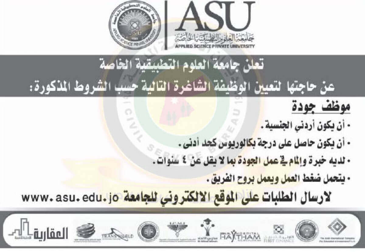 اعلان توفر شاغر موظف جودة صادر عن جامعة العلوم التطبيقية الخاصة
