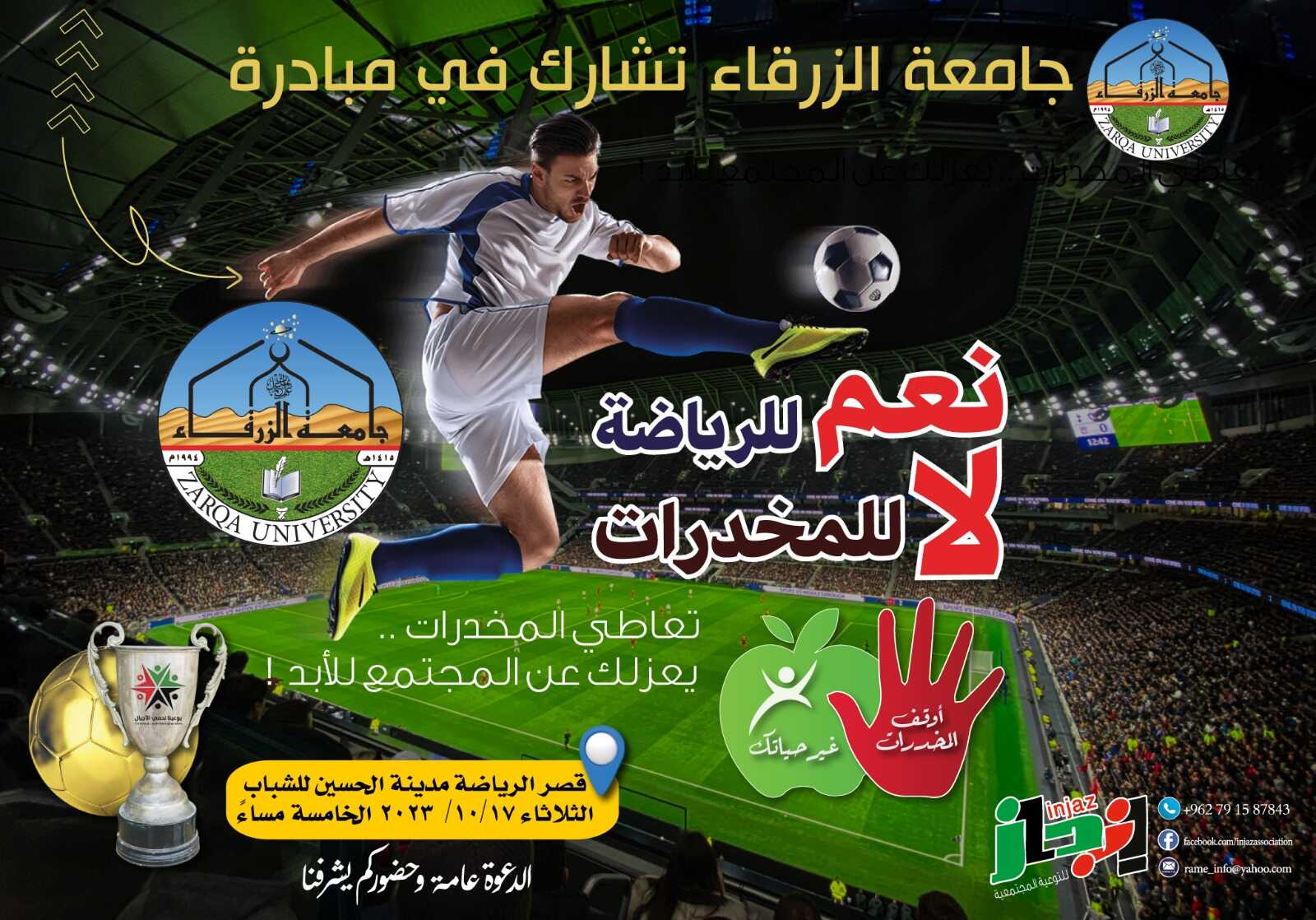 22 الاعلامي - برعاية وإهتمام مديرية الأمن العام جامعة الزرقاء تشارك بمبادرة (نعم للرياضة لا للمخدرات) بالتعاون مع الجهات الرسمية والتي ستنطلق مساء الثلاثاء الموافق 17/10/2023 في قصر الرياضة - مدينة الحسين للشباب، التي تنظمها جمعية إنجاز الأردنية للتوعية المجتمعية بالتشاركية مع الفعاليات الرسمية والشعبية