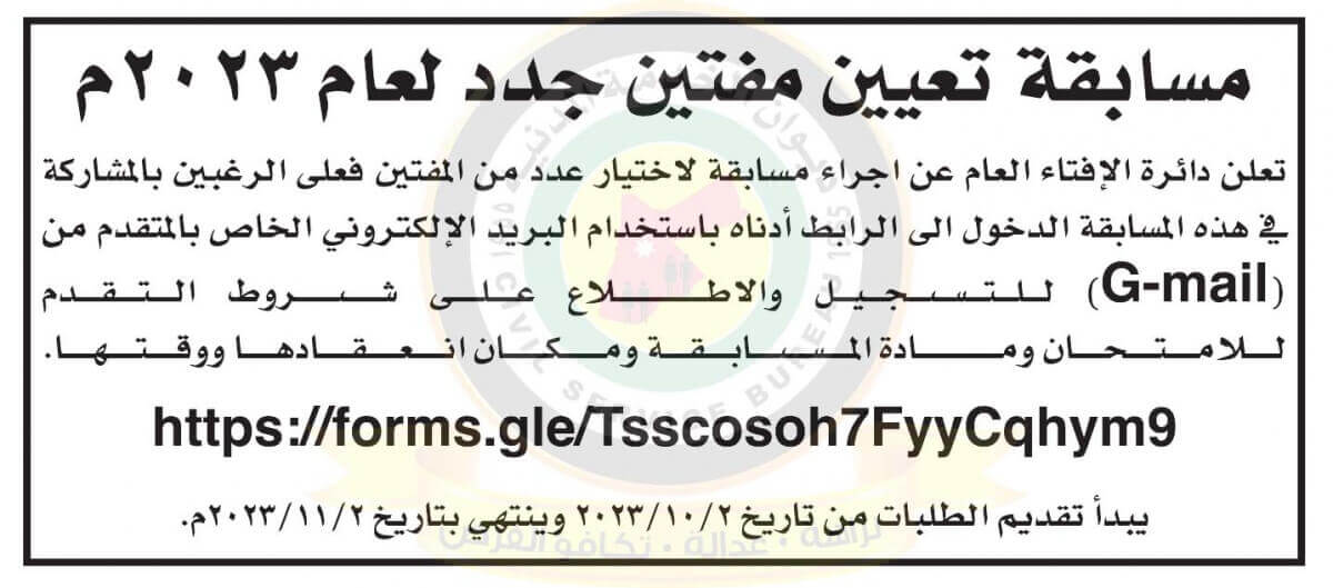 اعلان مسابقة تعيين مفتين صادر عن دائرة الافتاء العام