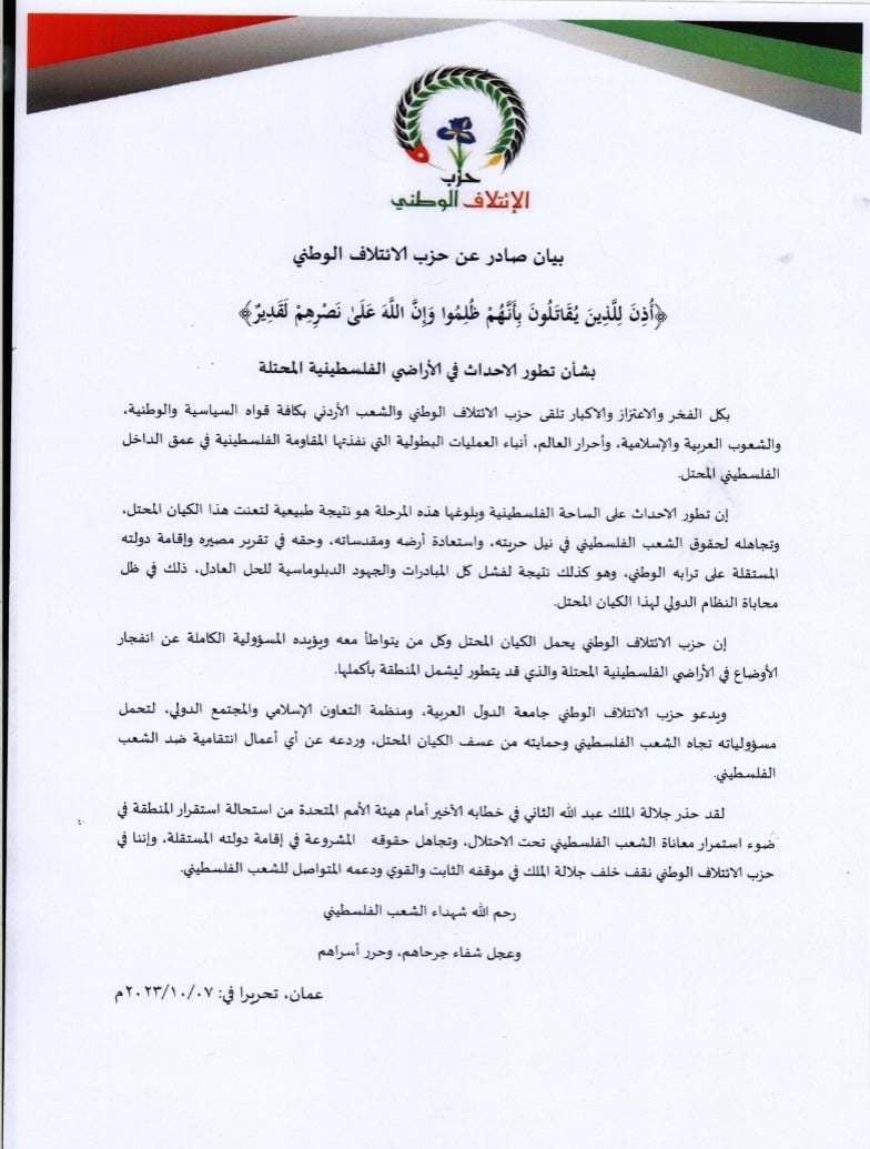 بكل الفخر والاعتزاز والاكبار تلقى حزب الائتلاف الوطني والشعب الأردني بكافة قواه السياسية والوطنية، والشعوب العربية والإسلامية، وأحرار العالم، أنباء العمليات البطولية التي نفذتها المقاومة الفلسطينية في عمق الداخل الفلسطيني المحتل.