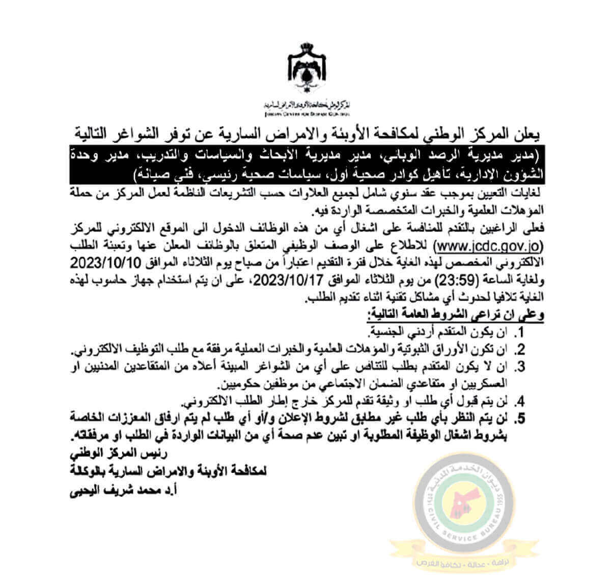 اعلان وظائف شاغرة بموجب عقد سنوي شامل لجميع العلاوات صادرعن المركز الوطني لمكافحة الأوبئة والأمراض السارية