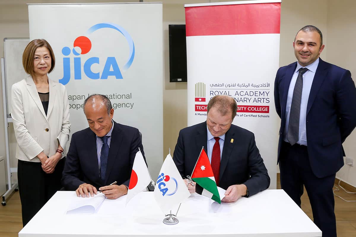 وقعت الأكاديمية الملكية لفنون الطهي، والوكالة اليابانية للتعاون الدولي (جايكا) اتفاقية تعاون، بهدف تطوير وتعزيز مهارات العاملين في قطاع الضيافة والسياحة في إقليم البتراء، من خلال تدريب عدد من العاملين في الفنادق السياحية في مقر الأكاديمية.