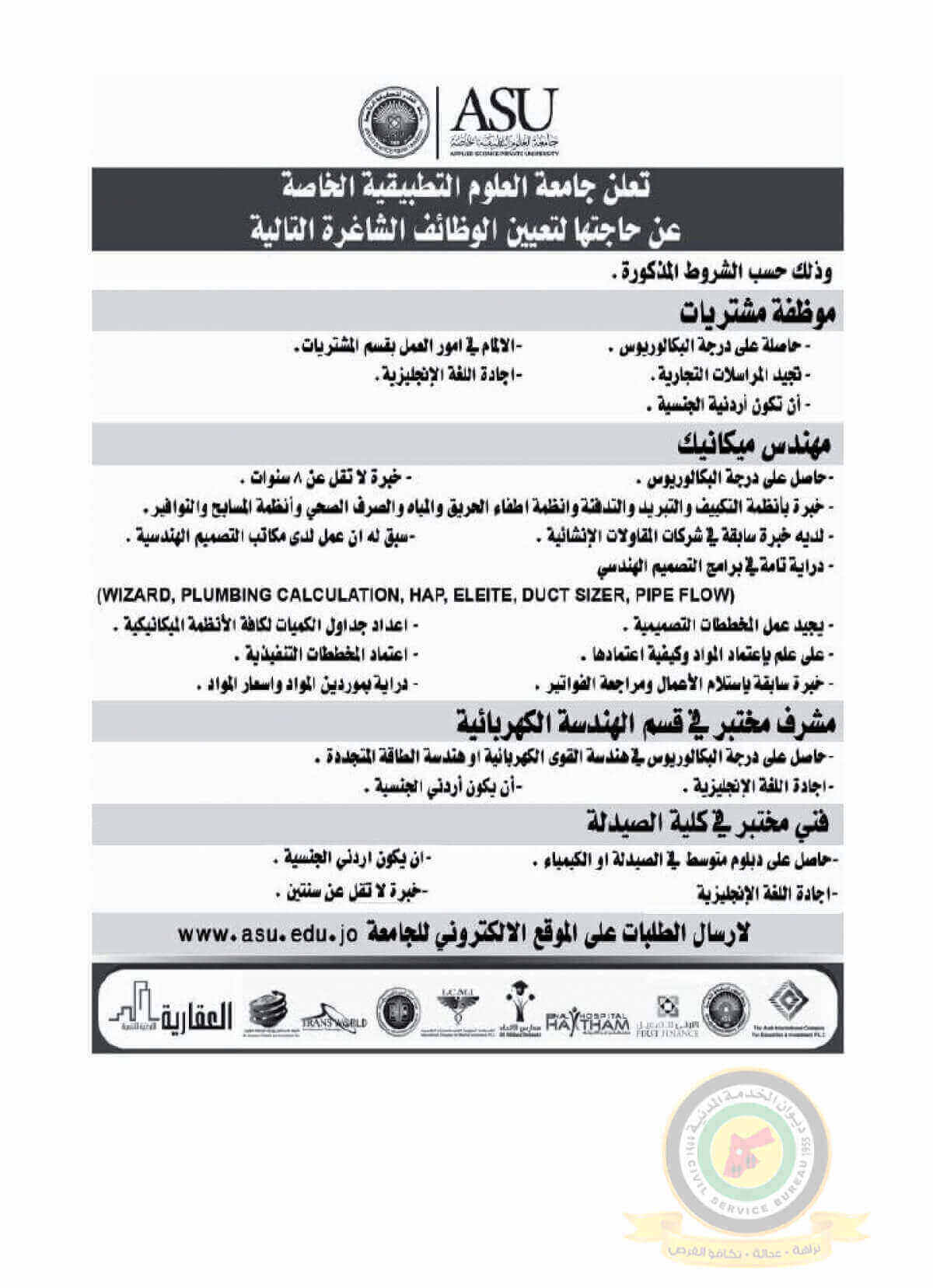 اعلان وظائف شاغرة صادرعن جامعة العلوم التطبيقية الخاصة