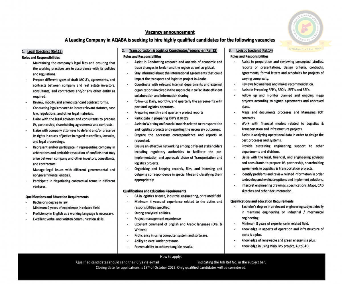 اعلان وظائف شاغرة صادرعن شركة رائدة في العقبة