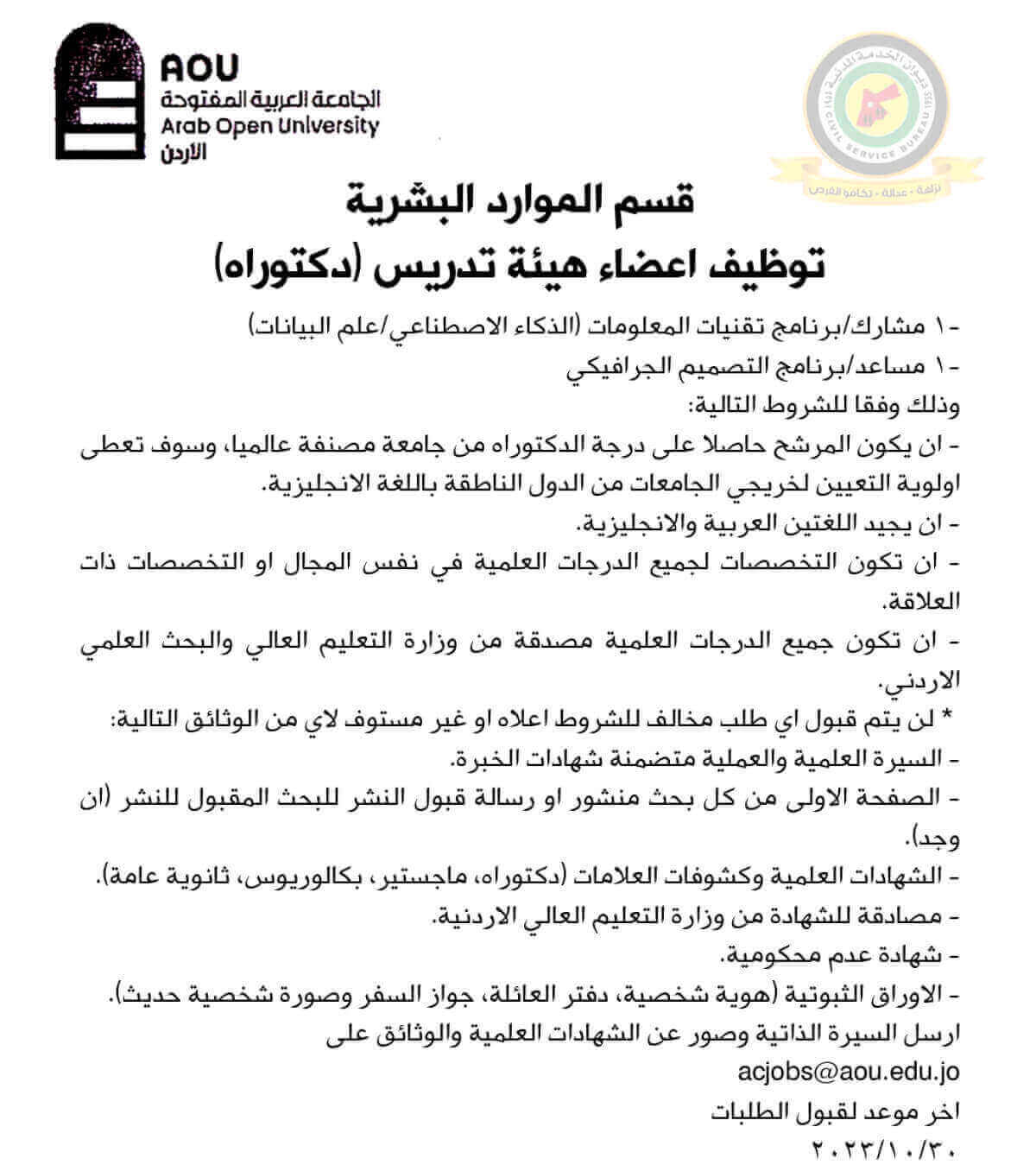 اعلان تعيين اعضاء هيئة تدريسية صادر عن الجامعة العربية المفتوحة