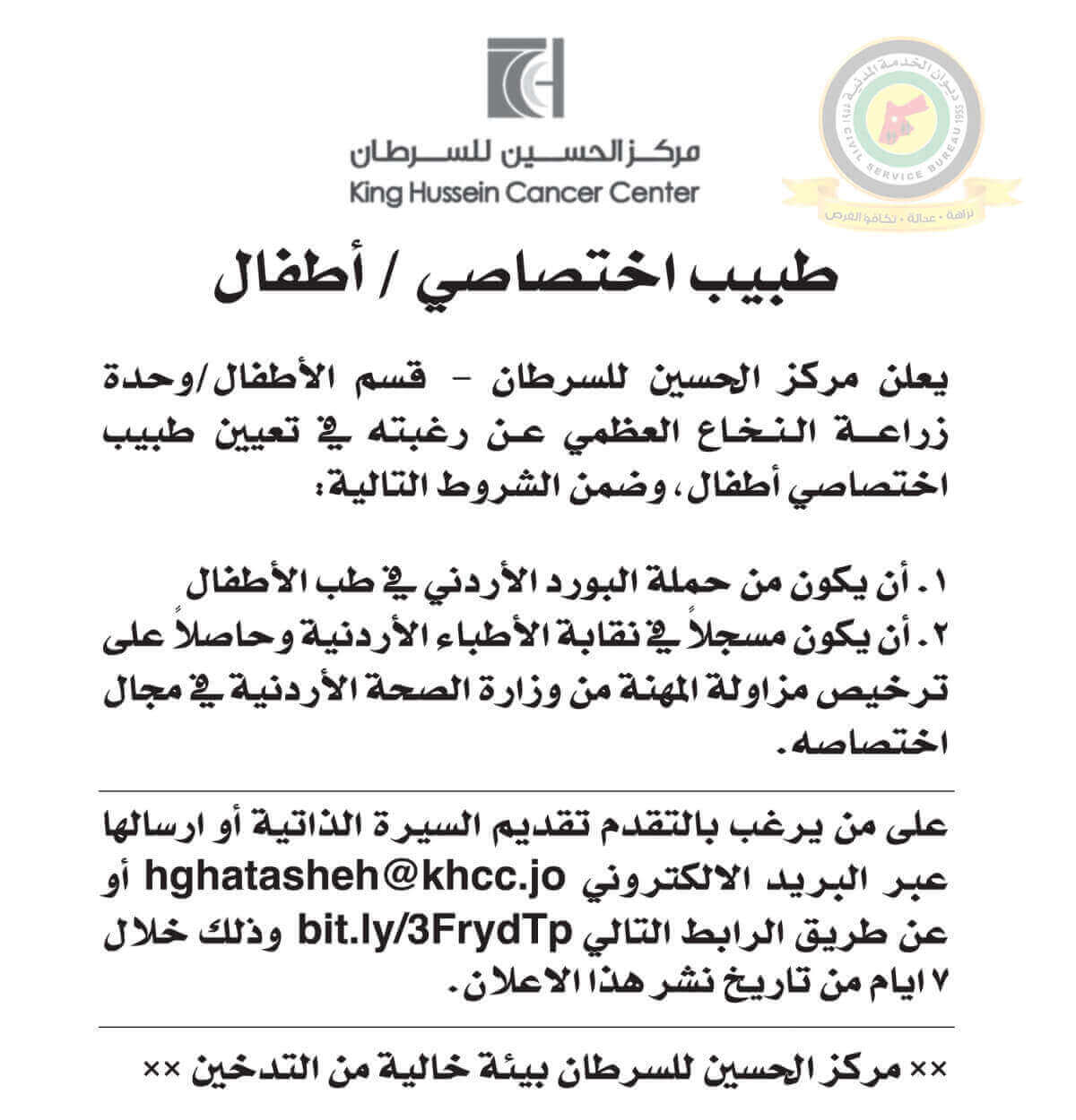 اعلان وظائف شاغرة طبيب اختصاصي أطفال صادرعن مركز الحسين للسرطان