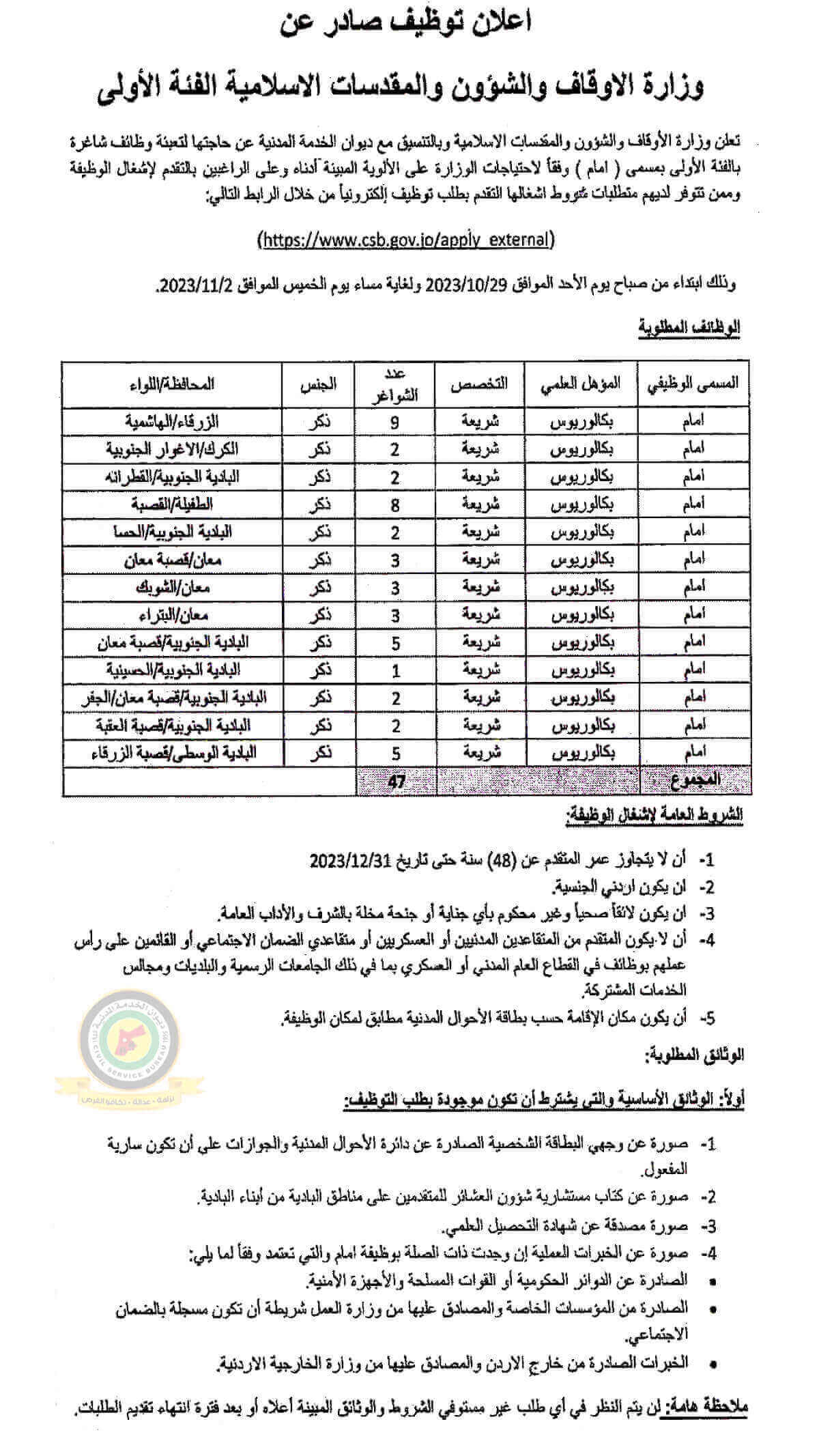 اعلان وظائف شاغرة بالفئة الأولى بمسمى إمام صادرعن وزارة الأوقاف والشؤون والمقدسات الإسلامية