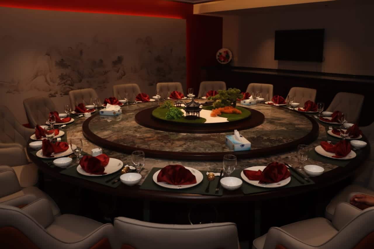 في مطعم القرية الصينية قصة نجاح لأبو رامي الصيني الذي يُطلع دائمًا ضيوفه في جولة على أروقه وجماليات التصميم الداخلي للمطعم والفراغات المملوءة عند الصعود إلى الطابق العلوي بتحف رائعة تدل على جمال المناظر والأدوات الصينية المستخدمة في المعيشة والطعام وغيره.