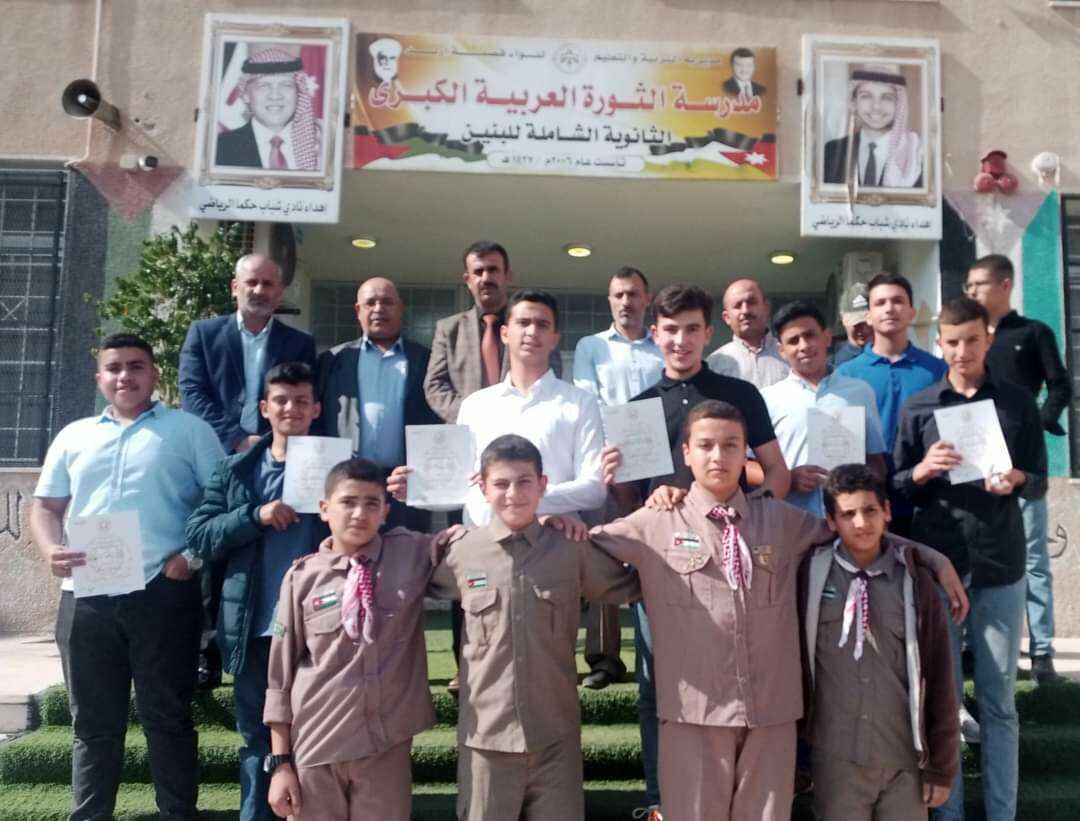 22 الاعلامي - كرم مدير التربية والتعليم للواء قصبة اربد الدكتور حمزة نجادات الطلبة الحاصلين على جائزة الحسن للشباب المستوى البرونزي في مدرسة الثورة العربية الكبرى.