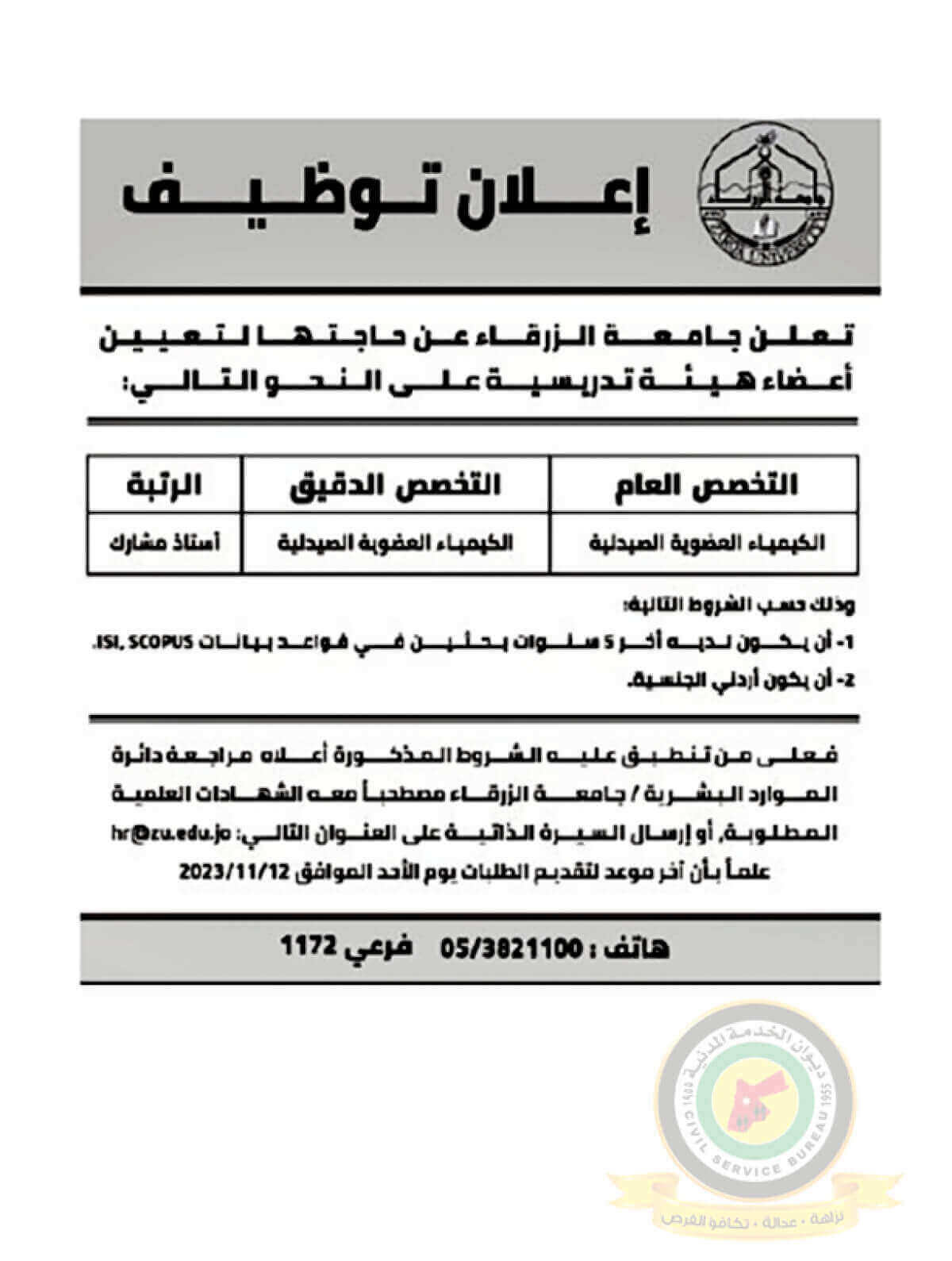 اعلان تعيين اعضاء هيئة تدريسية صادر عن جامعة الزرقاء