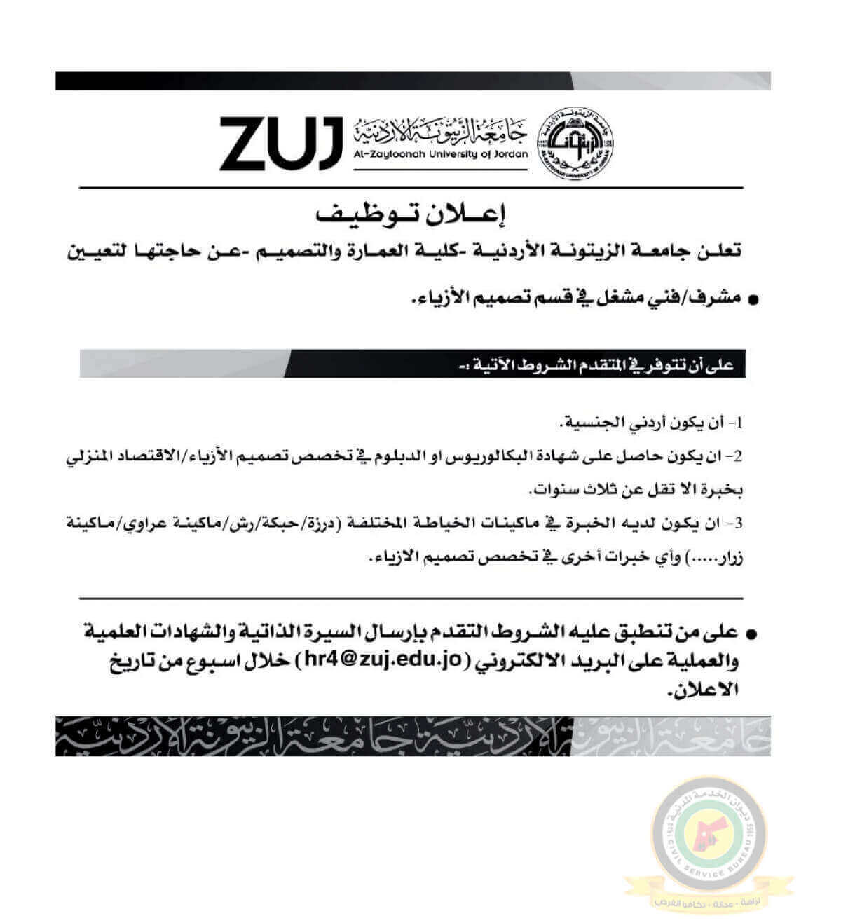 اعلان وظائف شاغرة مشرف / فني مشغل في قسم تصميم الأزياء صادرعن جامعة الزيتونة الأردنية
