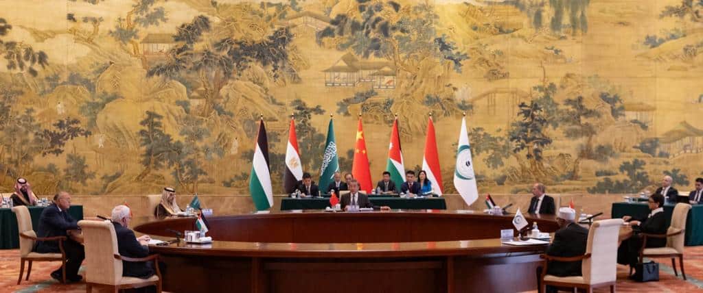 وأكد وزير الخارجية الصيني، دعم بكين للدعوة الصادرة عن قمة الرياض لحل الدولتين وفقا للقرارات الدولية ذات الصلة، كما دعا المجتمع الدولي إلى التحرك لإنهاء الكارثة الإنسانية في قطاع غزة.